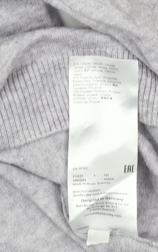 Step into effortless style with this Betty Barclay women's pullover jumper in a versatile grey hue. Crafted from a quality blend of 80% viscose, 15% polyester, and 5% nylon, this jumper offers both comfort and durability for everyday wear. Its regular fit and crew neck design make it a staple for any casual occasion, while the long raglan sleeves with button accents add a touch of elegance. Designed for all seasons, it's perfect for layering in autumn and winter, keeping you cosy yet stylish. At size 14, it is suitable for a regular fit, ensuring a comfortable wear. This jumper is in excellent condition, showing no signs of visible wear, making it a fantastic addition to your wardrobe. Embrace the all-seasons appeal of this sweater, ideally suited for various occasions, from relaxed outings to casual meet-ups. Hand wash only to maintain its quality and softness. With the trusted Betty Barclay brand, you're ensuring timeless style and lasting quality, making this jumper a worthwhile investment.