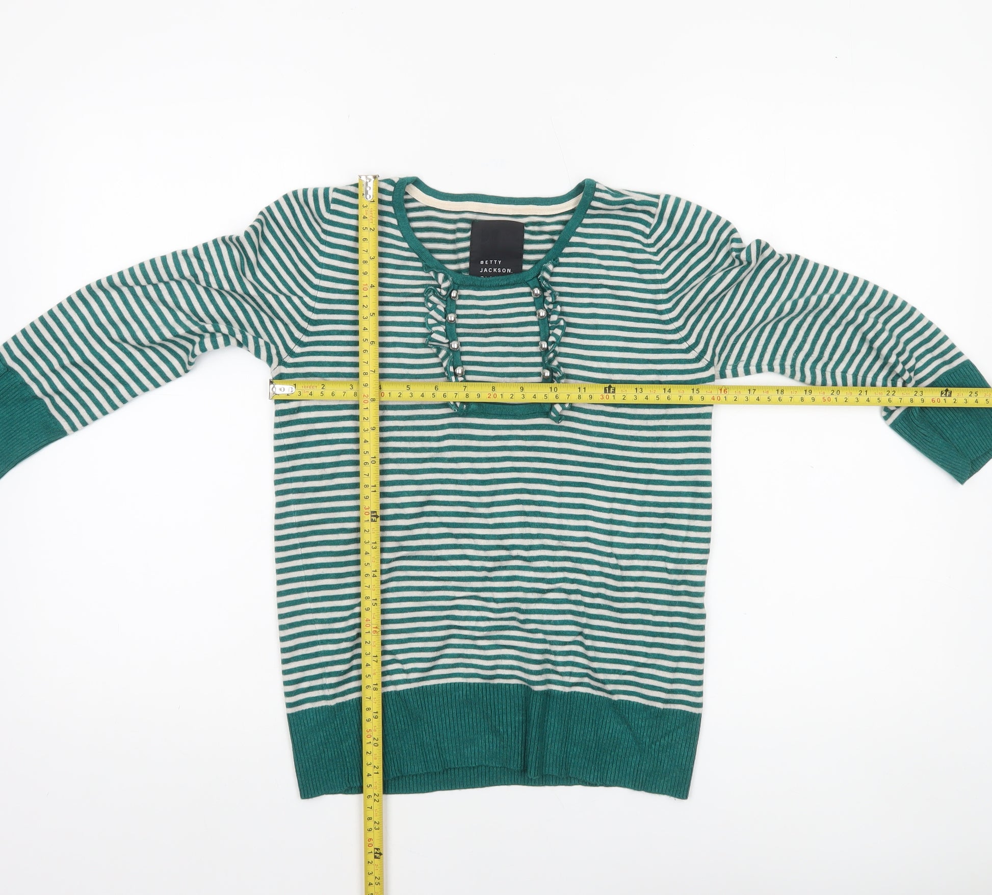 Elevate your everyday wardrobe with this stylish women’s green striped jumper from Betty Jackson Black. Crafted from a soft and breathable knit blend of viscose, polyamide, and elastane, this versatile piece offers comfort and a flattering fit. Designed in a classic pullover style, the jumper features a scoop neckline adorned with subtle lace-up detailing and long sleeves finished with button accents for a touch of unique charm. Its tight-knit construction and lightweight fabric make it perfect for layering or wearing solo across seasons. The ribbed cuffs and hemline help retain shape while adding a refined finish. The timeless green and white striped pattern adds a playful yet polished look suitable for both casual and smart-casual settings. Ideal for pairing with jeans, trousers, or skirts, this jumper transitions effortlessly from weekday outings to weekend relaxation. Designed to fit comfortably in a classic silhouette, it reflects effortless modern elegance with a hint of personality. Perfect for autumn, spring, or mild winter wear, this top combines everyday practicality with designer flair. Lightly worn and in excellent condition, it shows minimal signs of previous wear. A must-have staple for any wardrobe, it captures Betty Jackson Black’s signature style—chic, feminine, and easy to wear. Add a timeless touch to your knitwear collection today and enjoy the freedom of a stylish, easy-care jumper that pairs well with anything from tailored pieces to casual denim. An ideal addition for those seeking comfort with a touch of refined sophistication.