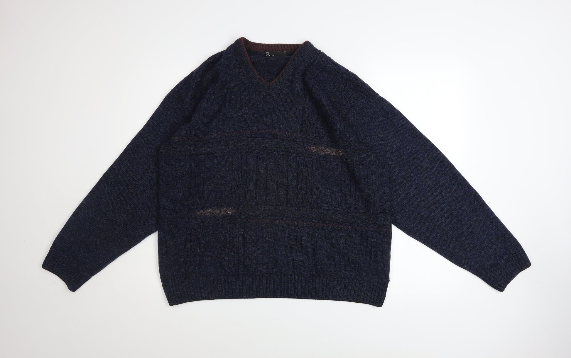 Update your cold-weather wardrobe with this classic BH men's blue wool blend V-neck pullover jumper, designed for comfort and timeless style. Crafted from a high-quality blend of 80% acrylic and 20% wool, this jumper offers the perfect balance of warmth, durability and softness against the skin. The deep navy tone is complemented by subtle geometric knit detailing, making it easy to pair with jeans, chinos or smart trousers for both casual and semi-formal occasions. The V-neckline adds a traditional touch that works well layered over collared shirts, while the long sleeves and ribbed cuffs ensure a comfortable, secure fit. Designed for everyday wear throughout the cooler months, this regular fit jumper keeps you cosy without feeling bulky. Made in the United Kingdom, it reflects dependable construction and styling that stand the test of time. Ideal for autumn and winter seasons, its breathable material allows for all-day comfort whether worn at home, the office or out for leisure. Though lightly worn, the jumper remains in very good overall condition, with minimal signs of use and a clean appearance. Effortlessly versatile and stylish, this jumper is the kind of essential piece every man’s wardrobe needs—perfect for layering, travelling, or simply staying warm in classic style. A dependable knit for years of wear, offering warmth and understated sophistication in equal measure.
