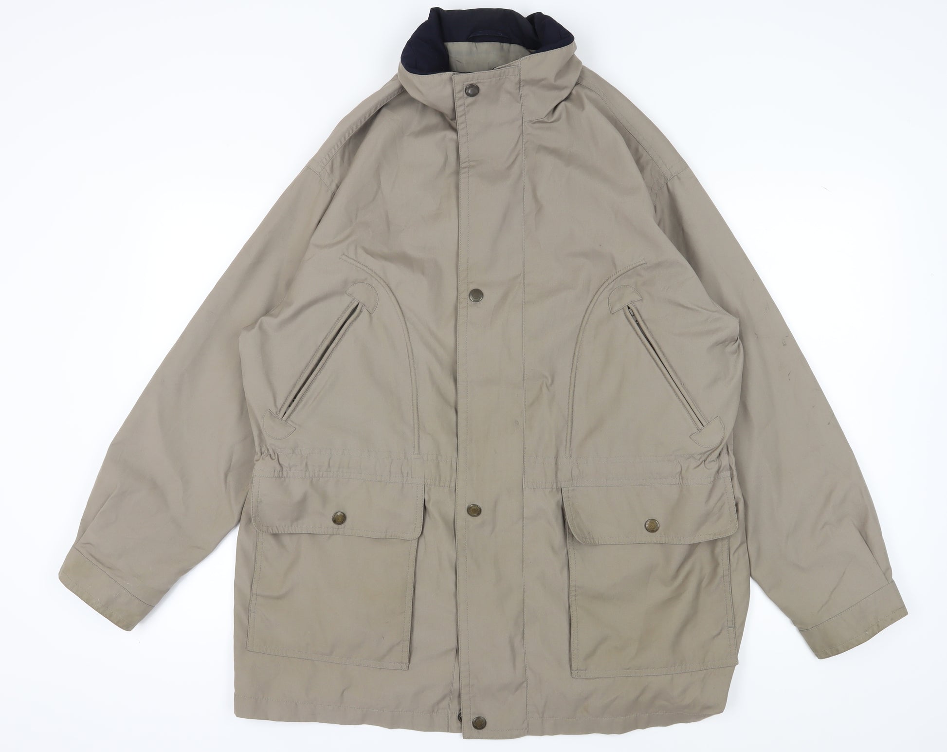 Elevate your autumn and spring wardrobe with this classic BHS Men's Beige Parka Jacket. Designed for those who value both comfort and style, this jacket offers a relaxed fit in a timeless parka style. Crafted from a durable blend of polyester and cotton, it promises to keep you warm and cosy during cooler days. The jacket features a sleek stand-up collar, which adds an element of sophistication to its casual appeal. You'll appreciate the practical elements such as a full zip and button closure, and multiple pockets perfect for carrying essentials or simply keeping your hands warm. While it's ideal for casual outings, its simple yet elegant design allows for versatile styling, making it a reliable addition to any man's wardrobe. Despite minor marks on the sleeve, it maintains a 'Very Good' condition and is machine washable for easy care. With a chest size accommodating most in the regular size type, this mid-length jacket serves both function and style for your daily ventures. Whether you're strolling through the city streets or enjoying a laid-back weekend getaway, this BHS parka jacket is your go-to for comfort and effortless fashion.
