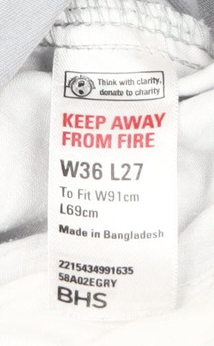 Elevate your wardrobe with these versatile BHS men's chino trousers. Crafted for comfort and style, these grey chinos are perfect for casual wear, offering a classic look that never goes out of fashion. Made from 100% cotton, they are soft to the touch and breathable, making them ideal for everyday use. With a waist size of 36 inches and an inside leg length of 27 inches, these trousers provide a comfortable fit. The flat front and straight leg design give a streamlined appearance, while the button closure adds a touch of sophistication. These trousers feature practical slash pockets for easy access to essentials. Although slightly wrinkled, they remain in very good condition, showing no signs of excessive wear. Machine washable for easy care, these chinos are a practical addition to any wardrobe. Whether you're out for a casual lunch or running errands, these BHS chinos offer a relaxed yet polished look. Don't miss the chance to own a piece that combines comfort, quality, and style. Grab them now and enjoy their timeless appeal.