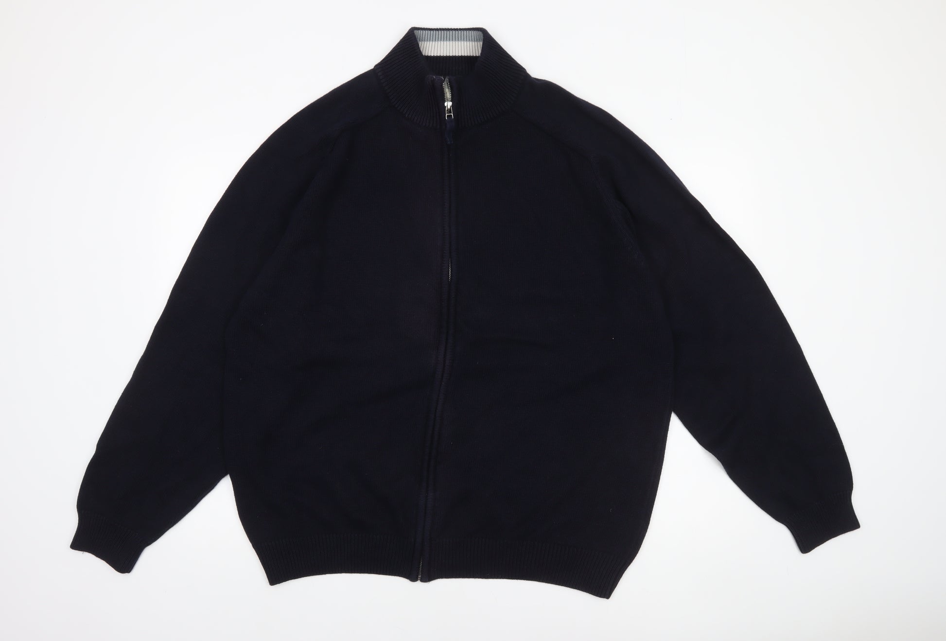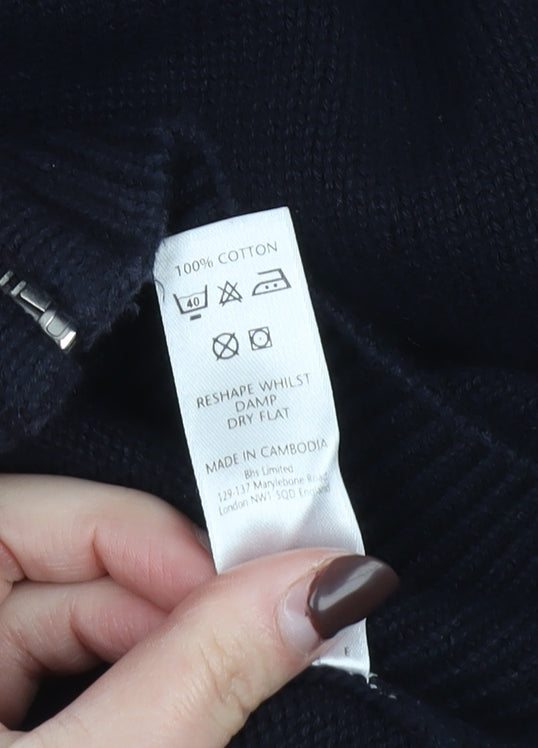 Stay effortlessly stylish and comfortable with this BHS Men's Full Zip Cotton Jumper in classic navy blue. Crafted from 100% cotton, this jumper offers a soft, breathable, and natural feel that makes it ideal for everyday wear across the autumn, winter, and spring seasons. Designed in a flattering regular fit, the jumper is offered in a 3XL size, suitable for a chest measurement of 47–49 inches (119–125 cm), ensuring an easy, relaxed look that feels just right. The full zip fastening makes it practical and versatile—wear it open over a shirt for a casual look or zipped up for extra warmth. The high neck design adds a touch of modern style while keeping you snug against cooler weather. Ribbed cuffs and hem provide a clean, fitted appearance while maintaining comfort and flexibility. With its simple, clean silhouette and no distracting patterns, this jumper allows for effortless coordination with jeans, chinos, or casual trousers. BHS is known for timeless style and dependable quality, and this piece is no exception. It’s lightweight enough for layering but durable enough to wear as a standalone top for milder days. Ideal for casual outings, travel, or workwear, it blends comfort with understated sophistication. This jumper has been lightly used but remains in excellent condition, showing minimal signs of previous wear and no visible damage, ensuring many more seasons of use. Machine washable for easy care, it will remain a practical staple in any man’s wardrobe. A classic essential that perfectly balances simplicity, comfort, and refinement, this jumper from BHS is a wardrobe must-have for any gentleman seeking durability and ease of wear in his knitwear collection.