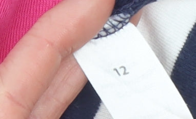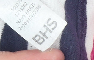 Add a cheerful burst of colour to your wardrobe with this BHS women’s navy and pink striped T-shirt, designed in comfortable 100% cotton for a soft and breathable feel. The multicoloured nautical-inspired stripe pattern creates a timeless yet playful look, ideal for casual everyday wear. Featuring a flattering scoop neckline and classic fitted 3/4 sleeves with button accents, this top brings a chic and stylish twist to a wardrobe staple. The cotton jersey fabric offers lightweight comfort, perfect for layering or wearing on its own during warmer seasons. Easy to care for and machine washable, this versatile top pairs effortlessly with jeans, shorts, or skirts for a relaxed weekend ensemble or a laid-back day out. The pullover closure ensures convenient wear with a neat finish. Suitable for spring and summer, this regular fit T-shirt combines comfort with classic style and a pop of modern colour contrast at the shoulders and cuffs. In excellent pre-loved condition with minimal signs of gentle use, it remains in great shape and ready to wear. Ideal for those seeking a breathable and easy-care piece that transitions smoothly from casual daytime looks to nautical-inspired holiday styles, this BHS top is perfect for refreshing your collection with effortless charm and lasting quality.