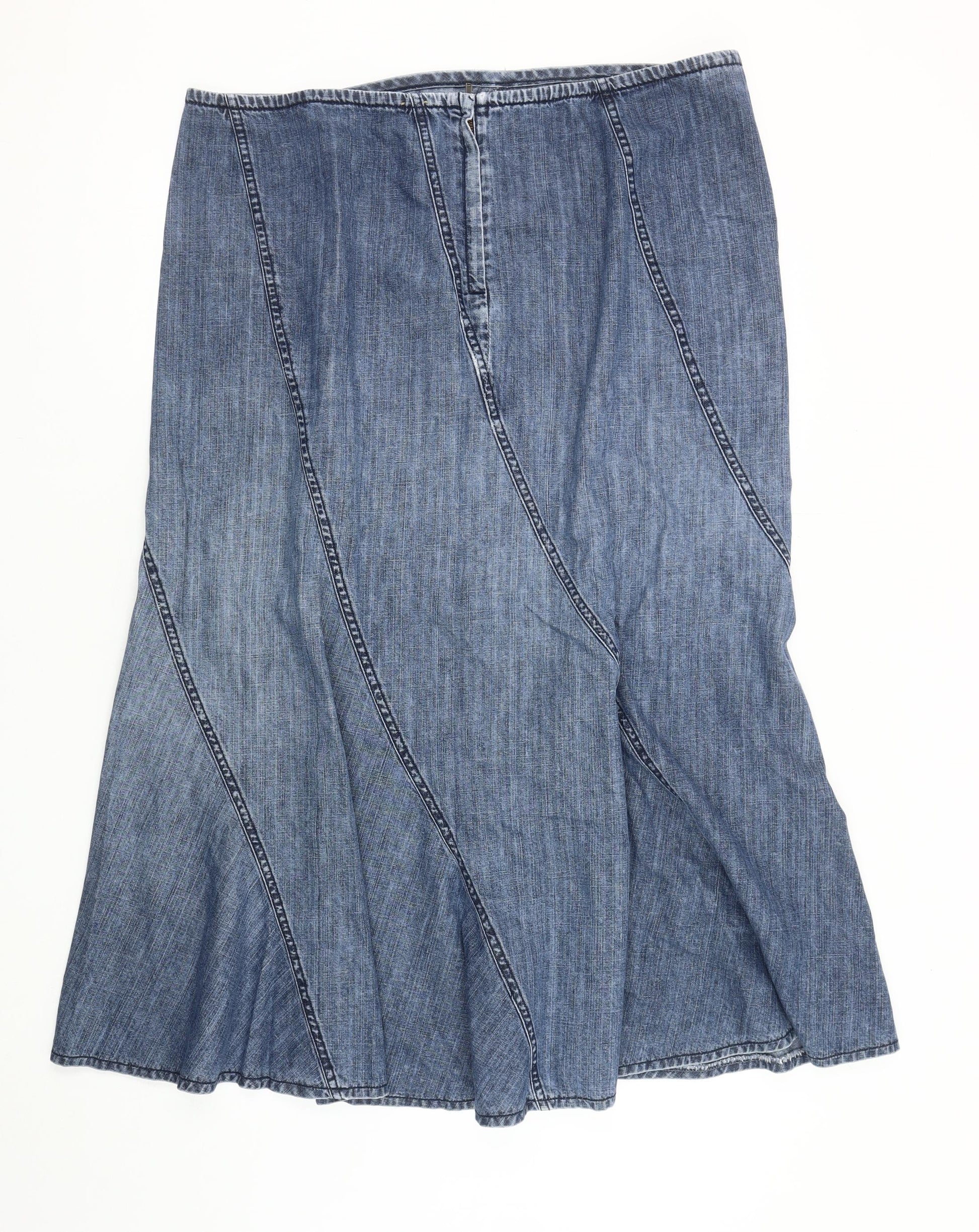Add a touch of classic style to your wardrobe with this elegant BHS Women's Blue A-Line Denim Skirt, available in size 18. Crafted from 100% cotton, this midi-length skirt offers a comfortable and breathable fit, making it ideal for casual occasions. The charming A-line style paired with the denim fabric brings a timeless, versatile look that you can dress up or down for any season. It features a mid-rise waist and secures with a reliable button and zip closure, ensuring a snug yet flexible fit. Designed for regular sizing, this skirt is machine washable for easy care. Despite being pre-owned, the skirt maintains an excellent condition with only minor wear, showcasing no visible defects. Its subtle, no-pattern design makes it a versatile piece for pairing with a variety of tops and accessories. Perfect for women who appreciate simplicity and quality in their clothing, this skirt is a must-have staple that will elevate your everyday outfits. Grab it now to enjoy comfort and style, all wrapped into one fantastic skirt!