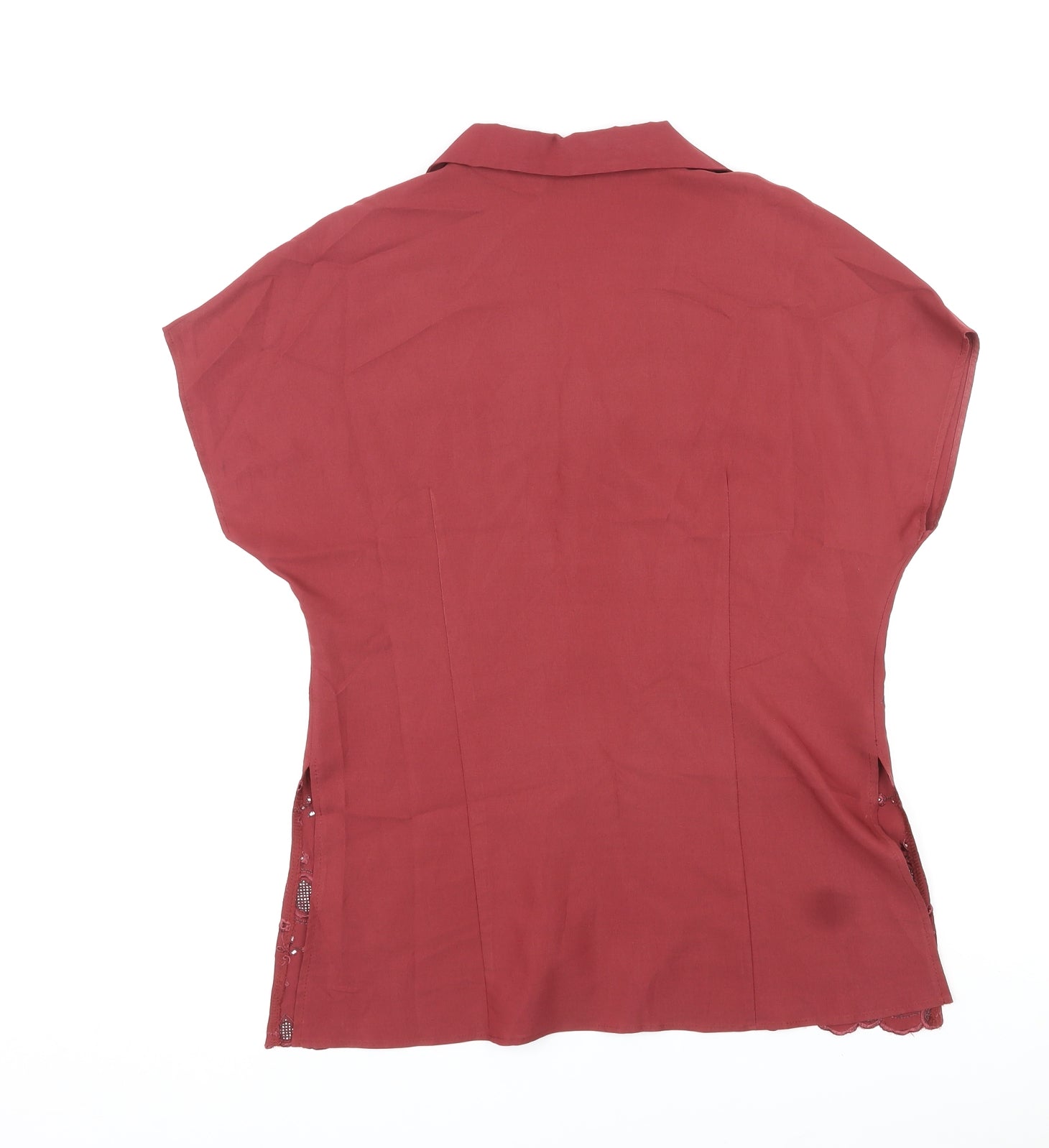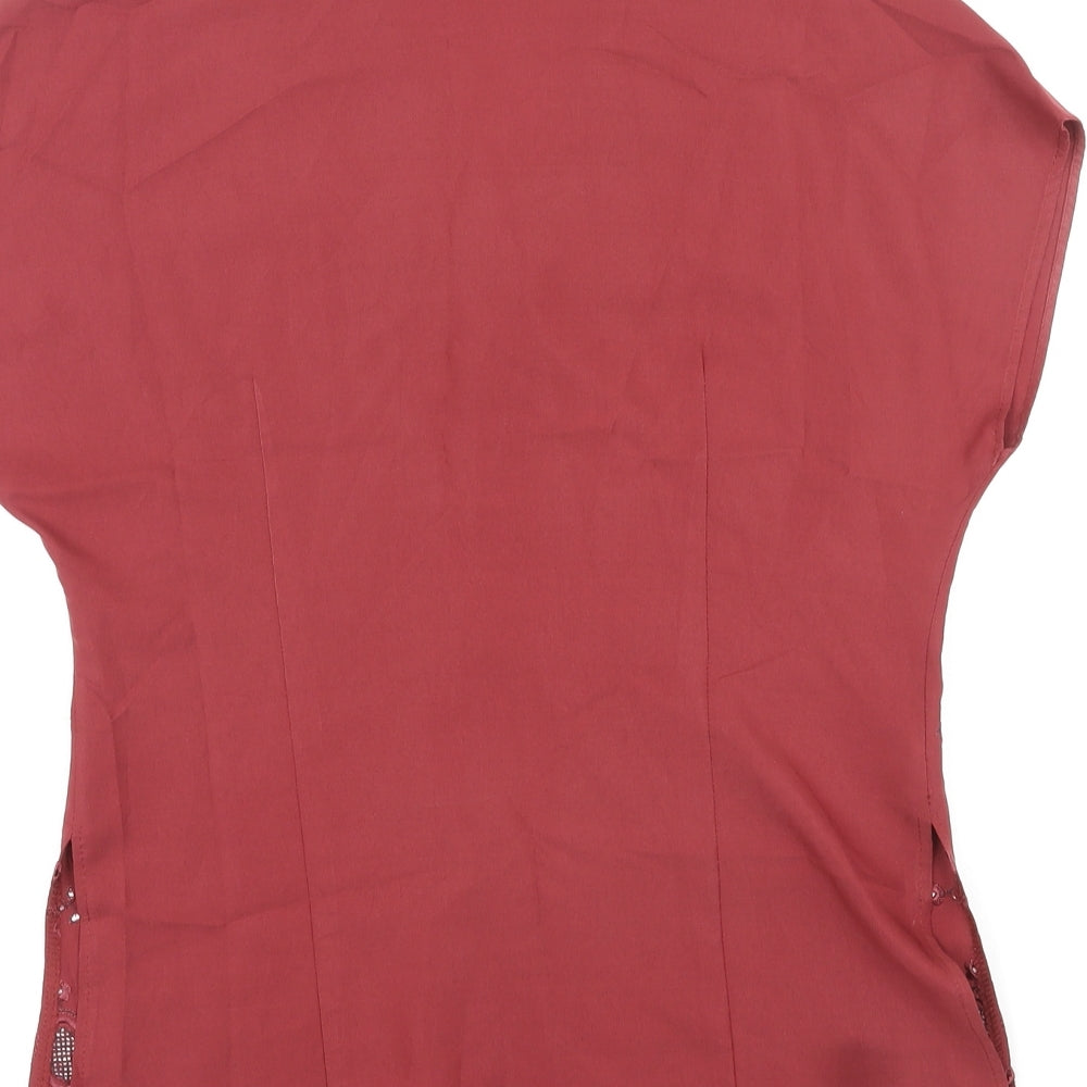 Womens Red Viscose Basic Button-Up Size 14 V-Neck - Embroidered Design by Hem
