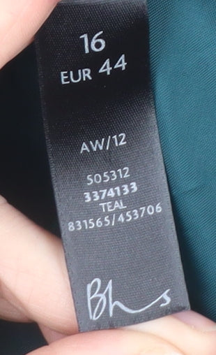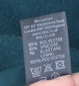 This elegant BHS women's teal green jacket in size 16 combines timeless tailoring with everyday practicality, perfect for the modern woman seeking comfort and refined style. The jacket features a soft polyester-viscose blend outer shell with a touch of elastane for flexibility, offering a flattering regular fit that drapes beautifully without restricting movement. Its deep teal shade adds a rich touch of colour to any wardrobe, making it an ideal piece for both casual outings and smart workwear looks. The jacket has a smart collared neckline, button fastening down the front, and discreet pockets for a neat, polished appearance. Its mid-length cut offers versatile layering potential, whether paired with trousers, skirts, or dresses. Designed for cooler weather, the piece is fully lined in smooth polyester for added comfort and durability, keeping you stylish and warm during autumn and winter seasons. The minimal design, accented by neat buttons, creates a classic aesthetic that stands the test of time. Condition is excellent throughout, showing only light signs of previous use with no visible marks or fabric damage. With its easy machine-washable care label and premium construction, this jacket balances sophistication with practicality. Perfect for everyday office wear, business meetings, or evening casual occasions, this BHS teal jacket is a reliable wardrobe staple that effortlessly transitions between settings. Its classic design, rich colour tone, and quality finish make it a must-have item for anyone who appreciates understated elegance and versatility in outerwear. A combination of comfort, durability, and refined style ensures this jacket remains a favourite piece season after season.