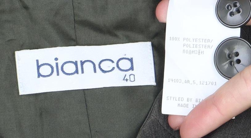 This Bianca women’s suit jacket offers a timeless and versatile addition to your wardrobe, designed with a professional finish in mind. Crafted in a classic woven polyester fabric, this jacket provides both structure and comfort, making it ideal for business, formal, and workwear occasions. The garment is a UK size 12 with a chest measurement of 40, providing a regular fit that flatters most body shapes. It comes in an elegant deep green tone, lending a sophisticated touch while remaining neutral enough to pair with various outfits.The jacket is cut in a single-breasted style with a smart shawl collar and mid-length design, giving it a refined yet contemporary edge. Fastening with four front buttons, it combines practicality with classic tailoring, while the long sleeves feature three-button detailing at the cuffs for a polished look. The jacket is fully lined in polyester for added comfort and structure, ensuring it maintains its shape throughout the day. Designed for durability and ease of care, this garment is dry clean only.Perfectly versatile, this Bianca jacket can be worn as part of a trouser suit or paired with skirt separates, making it a wardrobe essential for those who want a professional yet stylish piece. Its subtle, professional appearance ensures it works well in the office, during formal events, or on occasions that call for smart dressing.Condition is set at very good, with only light signs of wear visible and no obvious flaws to note. This assures quality at a competitive value, ensuring a long-lasting piece that retains both functionality and sophistication.If you are looking for an elegant suit jacket that balances style, comfort, and functionality, this Bianca polyester single-breasted jacket is a smart choice. It represents a blend of professional tailoring and modern elegance, ensuring you always look your best, whether in the office, at an event, or any formal setting.