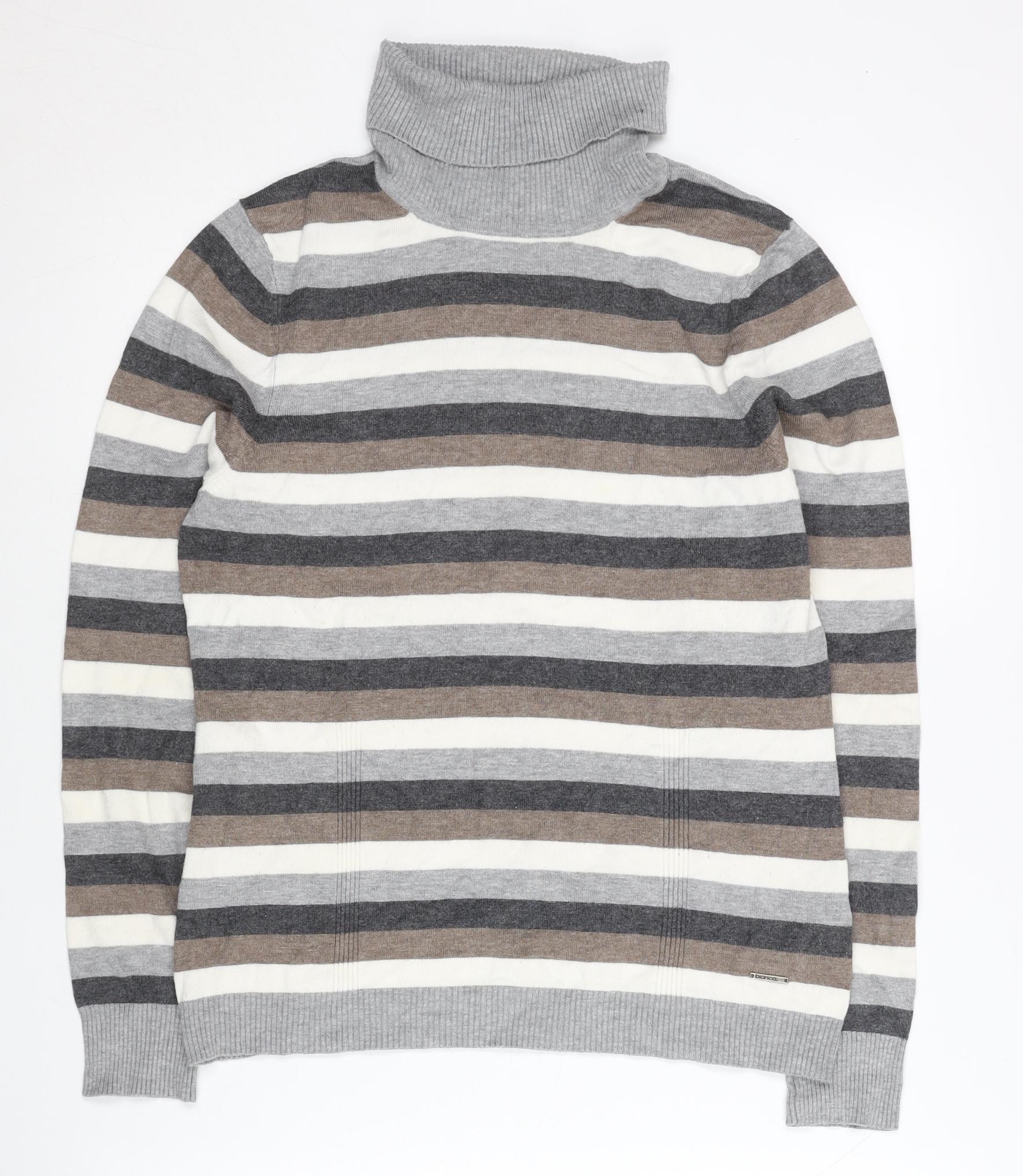 Elevate your casual wardrobe with this chic Bianca women's striped jumper, designed with both comfort and style in mind. This roll neck pullover features a timeless striped pattern in versatile shades of grey, white, and brown, offering an easy-to-wear colour scheme that pairs effortlessly with jeans, trousers, or skirts for multiple outfit options. Crafted from a soft and lightweight knit fabric, it is made from a comfortable blend of 80% viscose and 20% nylon for a durable yet stretchy finish that holds its shape beautifully. The roll neck design not only adds a stylish touch but also provides extra warmth and coverage during cooler seasons, making this a perfect layering piece for both autumn and winter. With its long sleeves and regular fit, this jumper ensures a flattering silhouette without compromising on comfort, making it a versatile essential for everyday wear. The tight-knit construction enhances the durability while maintaining a soft, smooth feel against the skin. Practical and easy to care for, this jumper is machine washable, ensuring convenience for your day-to-day lifestyle. It’s perfect for casual outings, relaxed weekends, or layering under a coat for chilly seasonal walks. While it has been gently used, it remains in very good condition with no notable flaws, offering excellent quality at a great value. Whether you are looking to refresh your wardrobe with a reliable everyday knit or on the hunt for a cosy jumper to keep you warm during the colder months, this Bianca striped jumper delivers the perfect mix of practicality and effortless style.