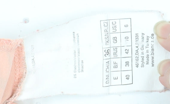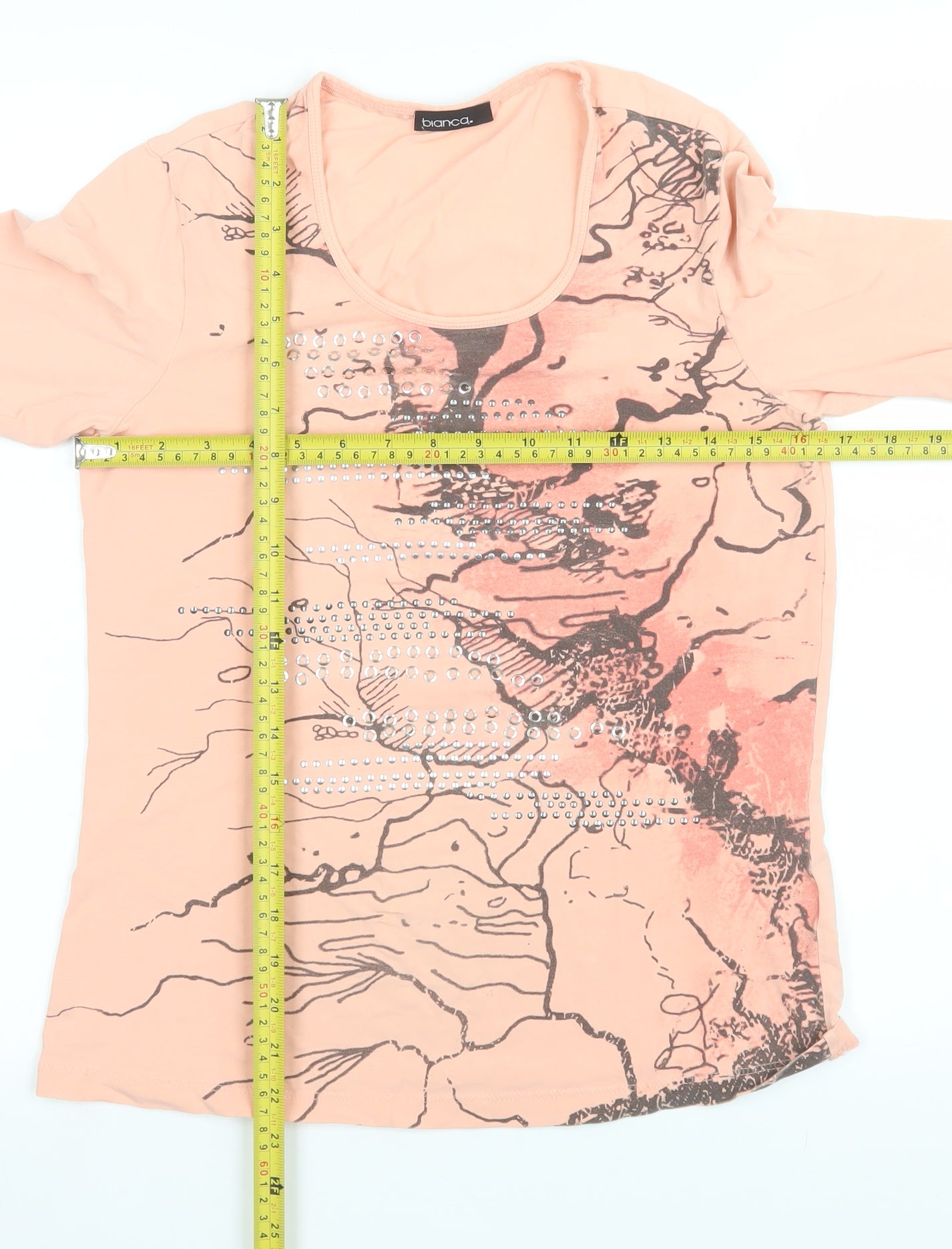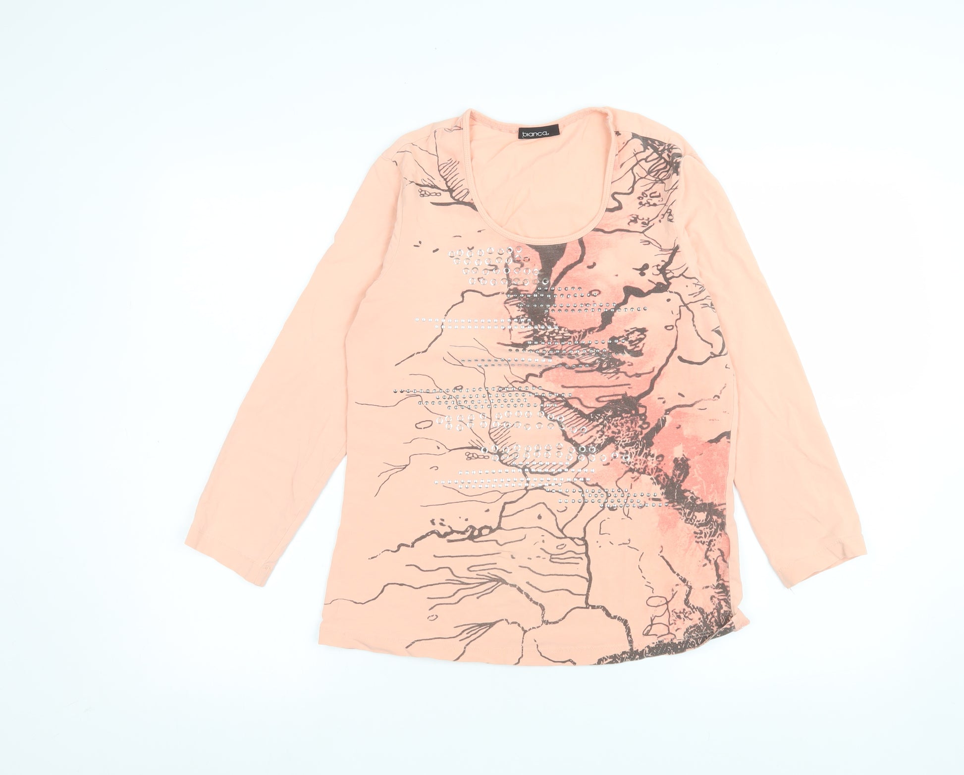 Enhance your everyday wardrobe with this elegant Bianca women's long sleeve T-shirt. Designed in a soft, comfortable jersey fabric crafted from 94% viscose and 6% elastane, this top offers a wonderfully smooth feel and a flattering regular fit. Its delicate pink tone creates a feminine and versatile look, while the striking rhinestone embellishments and abstract pattern across the front add a touch of glamour without being too bold. The scoop neckline gives it a classic and flattering shape, perfect for pairing with jeans, trousers, or skirts for a range of stylish casual looks. This Bianca top is lightweight and stretchy, providing effortless comfort and freedom of movement. The long sleeves make it ideal for layering in spring and autumn or for wearing on its own during cooler summer days. Designed with quality in mind, it is easy to care for and machine washable, ensuring convenience as well as timeless style. The pullover closure and regular fit keep it simple and practical, making it a fantastic everyday wardrobe staple.The soft jersey material feels breathable and comfortable, perfect for those who appreciate a mix of style and comfort. Whether you're heading out for lunch, traveling, or relaxing at home, this Bianca rhinestone top adds sophistication to your casualwear collection. In excellent pre-owned condition with minimal signs of wear, it presents beautifully with no flaws or damage. This women's Bianca T-shirt is a must-have for anyone seeking a stylish and comfortable piece that transitions effortlessly between occasions — casual, workwear, or travel. Add it to your collection and let its understated charm uplift your wardrobe.