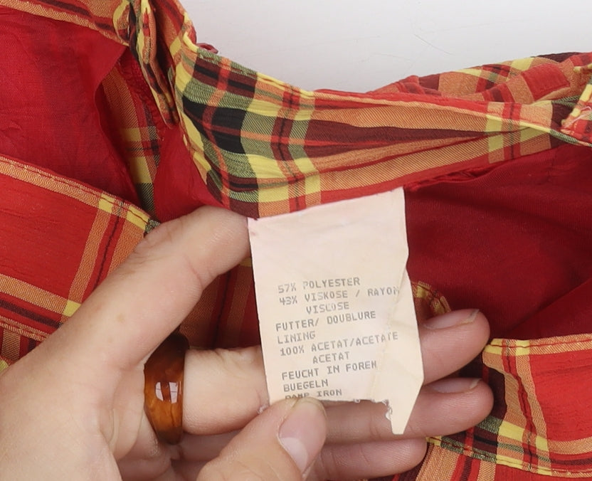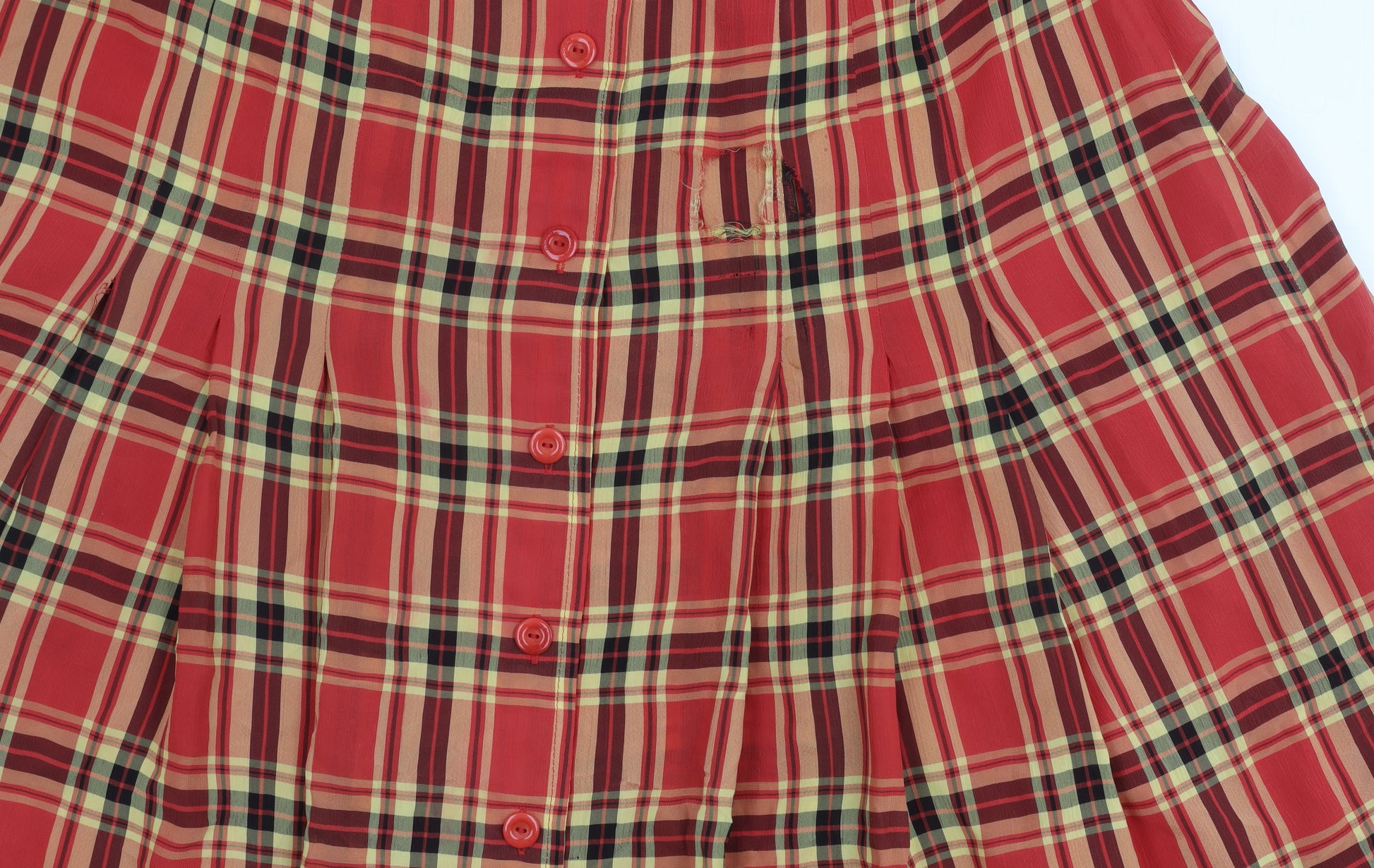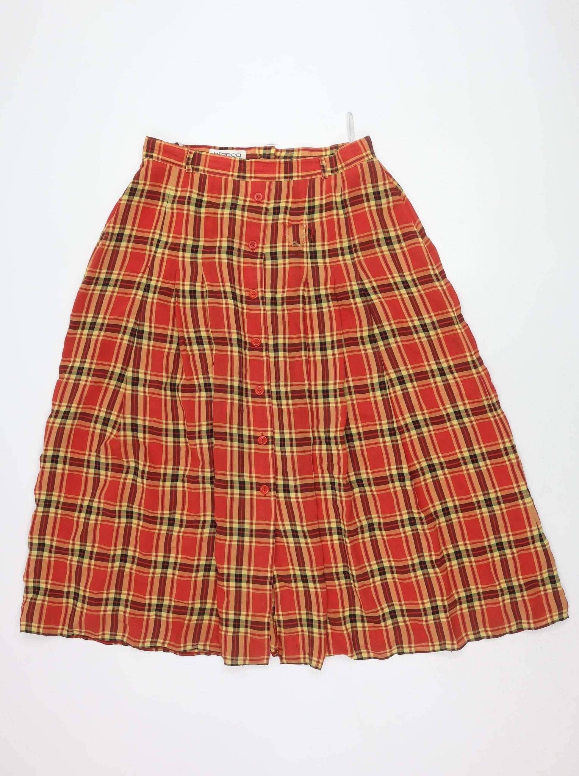 Explore timeless elegance with this Bianca women's plaid pleated skirt in a vibrant red hue. Sized at UK 14, this stylish skirt is perfect for a chic and fashionable look. Crafted with a blend of 57% polyester and 43% viscose, it offers a comfortable fit and feel. The skirt features a classic pleated style, enhanced by charming button accents, making it an ideal addition to your wardrobe for casual days or semi-formal occasions. Despite a visible tear in the fabric, the skirt retains its charm and versatility, offering a unique opportunity to own a piece with character. Pair it with your favourite tops and accessories to create a range of stunning outfits. Don’t miss the chance to add this fashion staple to your collection at an unbeatable price.