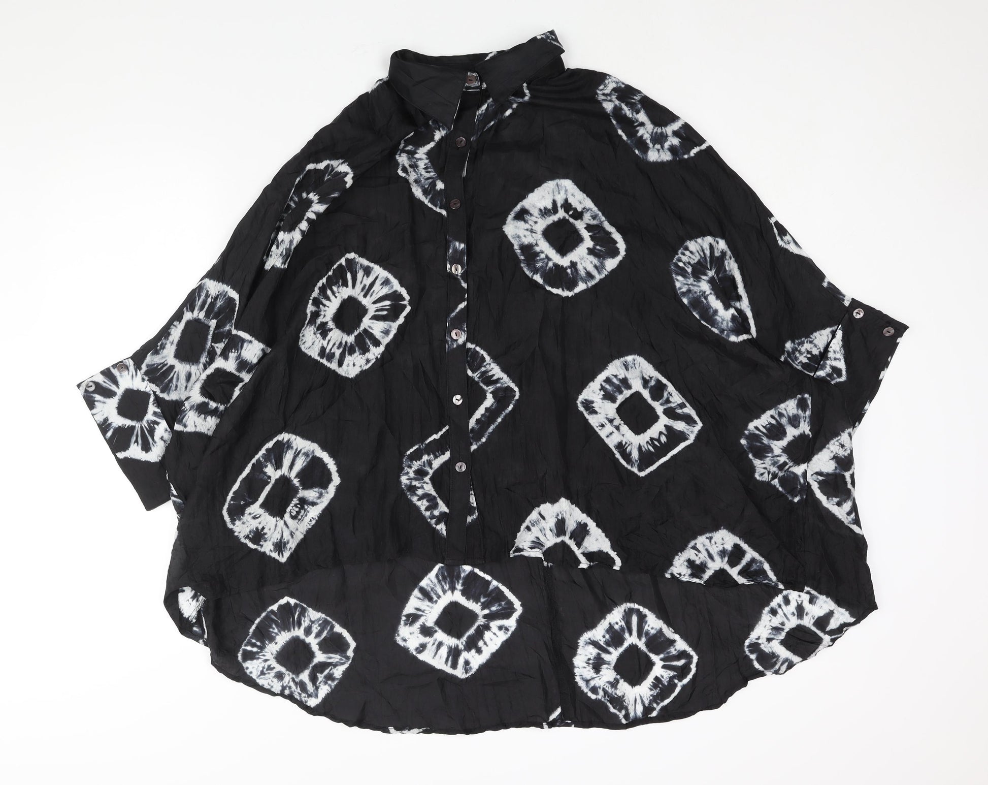 Womens Black Geometric Silk Basic Button-Up Size M Collared - Hi-Low Hem Tie Dye