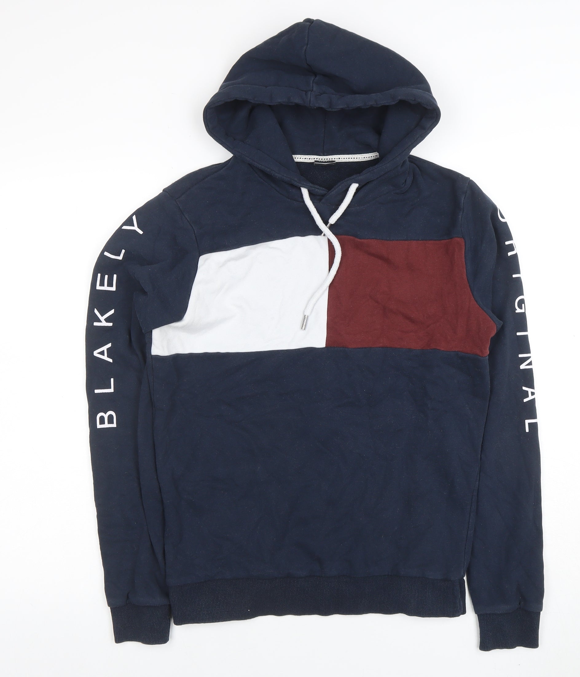 This Blakely Original men’s hoodie combines casual comfort with a timeless style, making it a wardrobe essential for everyday wear. Made from soft and breathable 100% cotton jersey, this pullover hoodie offers a cosy yet lightweight feel suitable for year-round comfort. The navy blue colourway is complemented by a striking colour-blocked front in shades of white and maroon, giving the piece a distinctive and modern appeal. Its classic drawstring hood and ribbed hem and cuffs provide a secure and comfortable fit, perfect for layering or wearing solo. Designed with a relaxed regular fit, this hoodie adds effortless cool to any casual outfit, from lounging at home to heading out for an off-duty day. The Blakely branding runs boldly down the sleeves in white, giving it a graphic, sporty edge that enhances its streetwear vibe. Functional details, like its non-zip pullover style and ribbed trim, maintain a clean silhouette that works perfectly with jeans, joggers, or shorts. With its quality construction and on-trend logo detailing, this piece delivers both style and practicality. Ideal for men who appreciate versatile athleisure wear, the Blakely hoodie suits cooler autumn evenings, mild spring days, and layered winter outfits. The cotton fabric ensures lasting comfort and breathability, while the premium build reflects Blakely’s dedication to stylish everyday apparel. In very good pre-owned condition with only minimal signs of wear, this hoodie promises many more seasons of fashionable and comfortable wear. A must-have piece for those who like their casual wear simple, bold, and unmistakably modern.