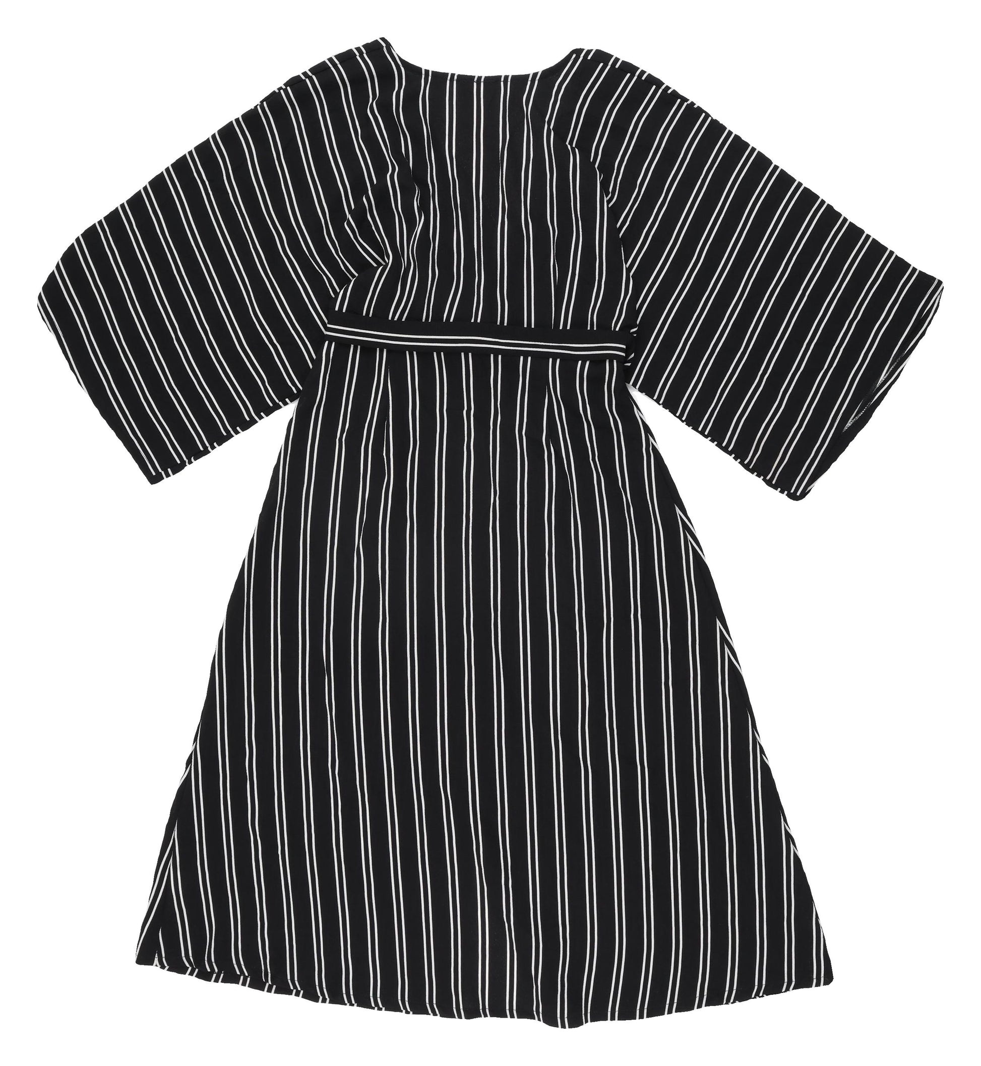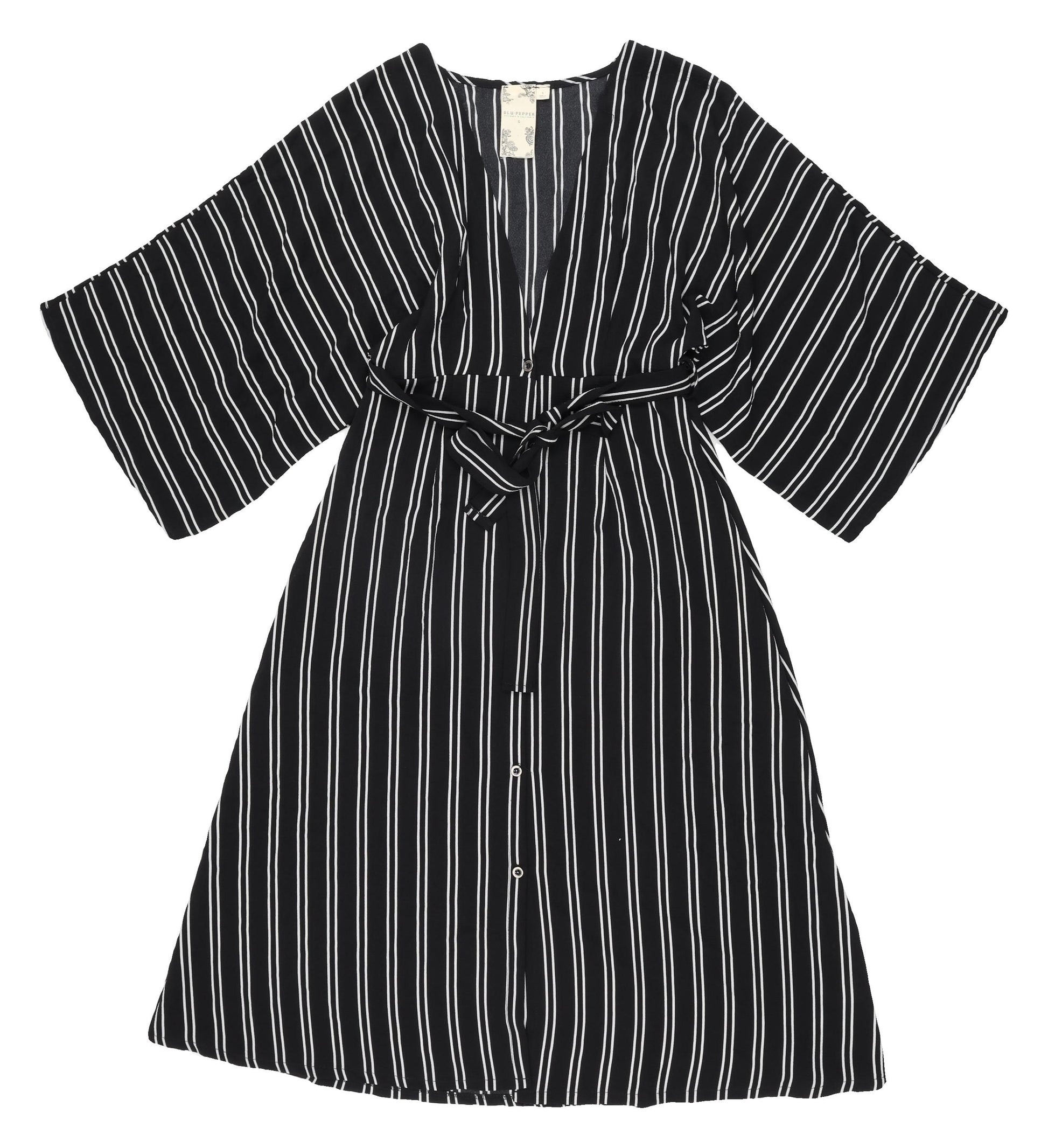 Upgrade your wardrobe with this stylish Blu Pepper Women's Black Striped Shirt Dress, perfect for casual outings and get-togethers. Designed with a flattering V-neckline and a trendy button closure, it adds a touch of elegance and sophistication to your look. The classic black striped pattern makes it versatile for various occasions, while the 3/4 kimono sleeves offer a unique flair, allowing you to showcase your fashion sense effortlessly. Made from a comfortable polyester and elastane blend, this dress is as cozy as it is chic, perfect for the warmer spring and summer seasons. Designed for easy wear, it's perfect for those who value comfort without compromising on style. This regular-fit dress in size S ensures a perfect fit for everyday wear, and the belted accent highlights your waistline beautifully, creating a flattering silhouette. Easy to care for with a simple hand wash, it stays looking fresh and vibrant with minimal effort. Ensure you stand out in style with this must-have wardrobe staple, an ideal choice for those looking to enhance their fashion-forward collection effortlessly.