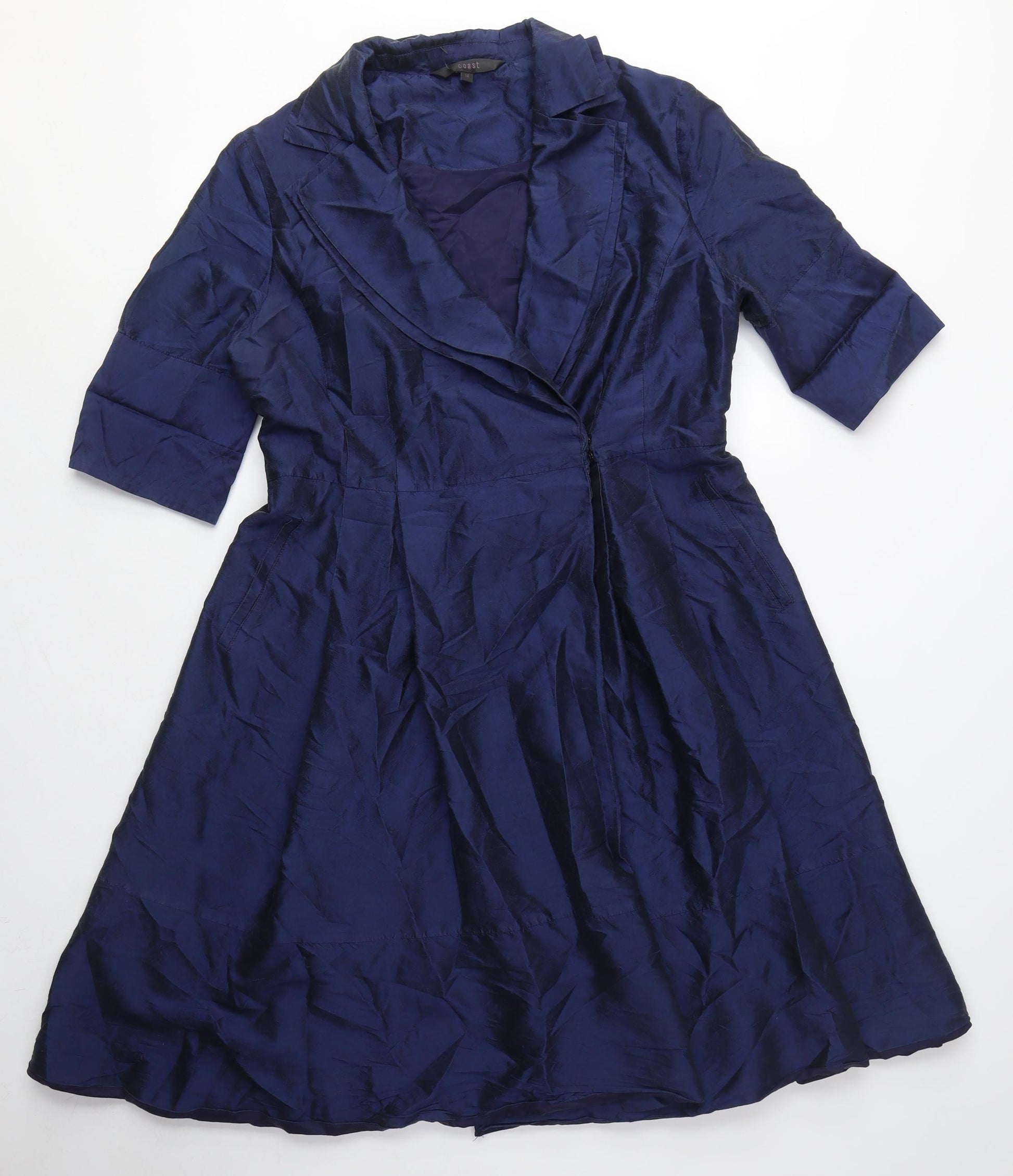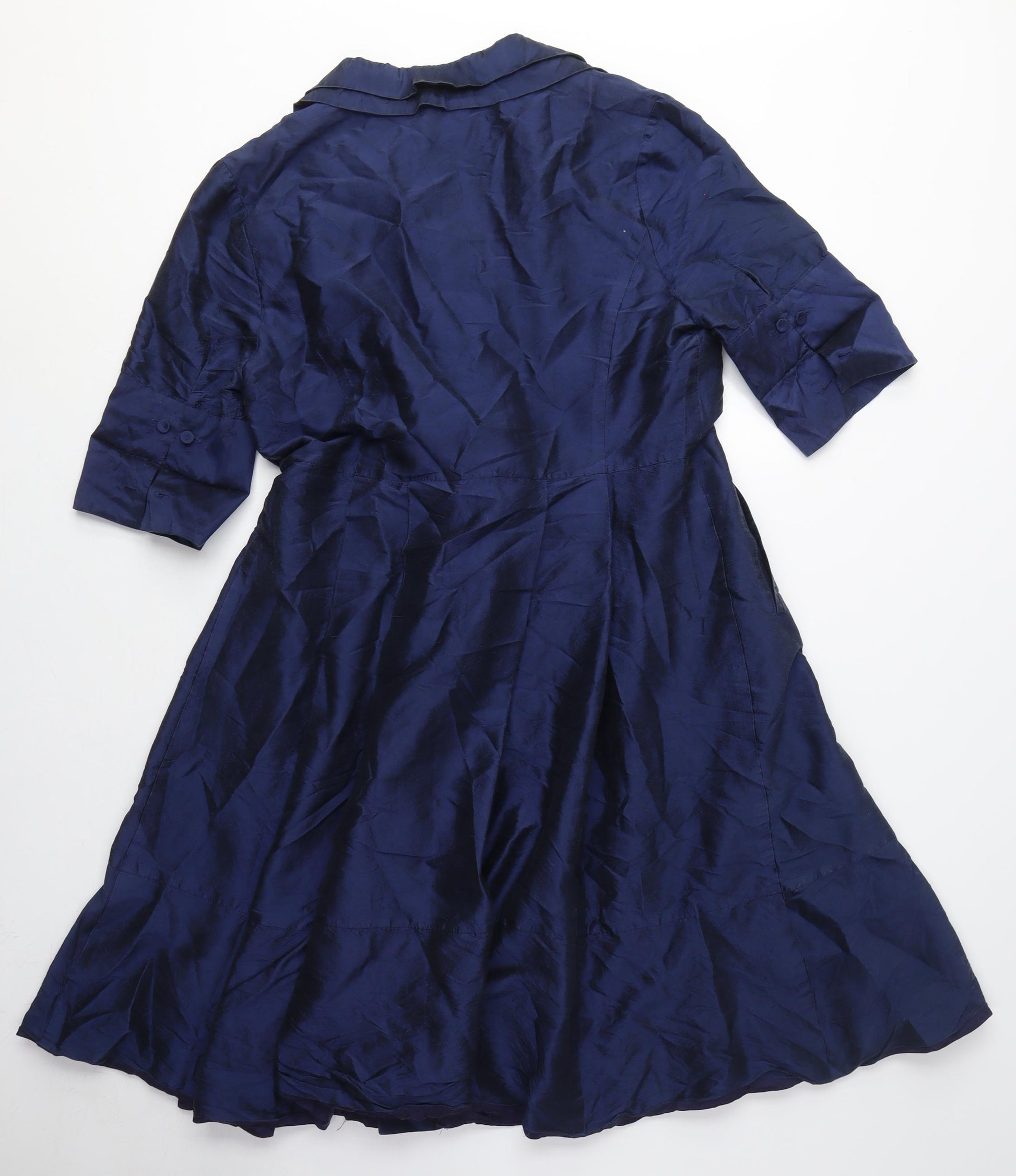 Dive into timeless elegance with this stunning blue fit & flare dress, perfect for a variety of occasions. The rich blue hue complements its classic style, making it a versatile choice for casual outings or cocktail parties. Crafted with attention to detail, this dress features a flattering collared neckline and 3/4 sleeves, offering a sophisticated yet comfortable fit. The knee-length design ensures a demure and versatile appearance, ready to pair with your favourite accessories. Its button accents add a touch of class, while the woven fabric showcases durability and quality. Ideal for autumn and spring, this dress is not only stylish but also practical, ensuring you look your best season after season. Despite slight creasing, the dress remains in excellent condition, reflecting minimal wear. Elevate your wardrobe with this essential piece that promises to deliver both comfort and style. Whether you’re attending a special event or enjoying a leisurely day, this dress is your go-to choice for elegance and ease.