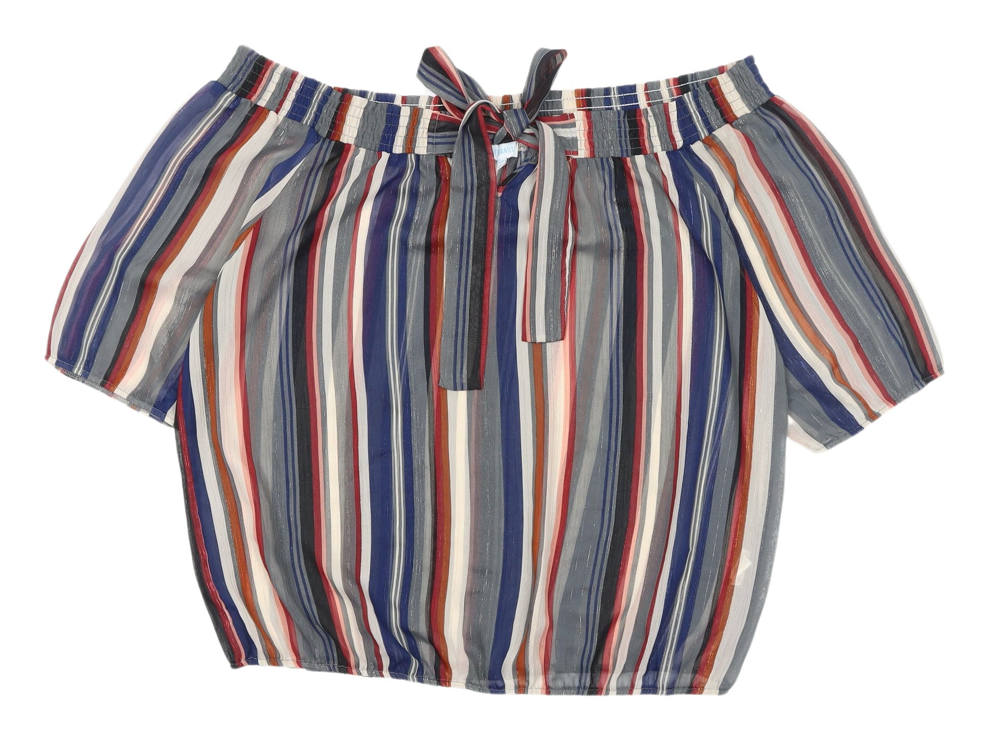 Elevate your wardrobe with this vibrant Blue Vanilla blouse, perfect for casual outings and stylish spring and summer days. This off-the-shoulder piece showcases a striking multicoloured striped pattern that brings a lively touch to your outfit. Made for women, the blouse offers a lightweight, regular fit that's enhanced by its airy, woven polyester fabric, ensuring comfort throughout the day. The puff sleeves add a feminine charm, while the elasticated neckline allows for a versatile fit. With a chic tie closure, this piece is easy to wear and ideal for layering or making a statement on its own. Its machine washable care instructions provide practical convenience. Embrace a blend of style and functionality with this blouse, designed for modern women looking to mix elegance with everyday ease. Pair it with your favourite jeans or a summery skirt and you're ready for a day out. Perfect for casual settings, this top also works for travel and relaxed gatherings. Capture attention and stay comfortable in this unique Blue Vanilla creation.
