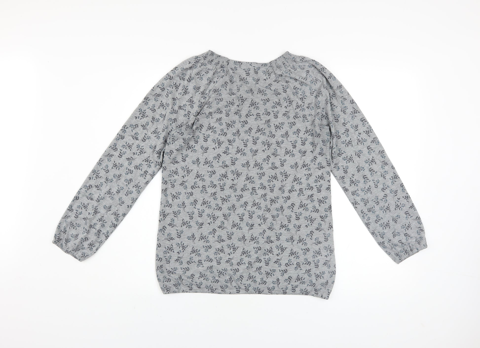 Bring comfort and easy style to your wardrobe with this lovely grey floral blouse from Bm Casual. Designed for women, this top offers a flattering and relaxed fit that makes it a great choice for everyday wear. Crafted from a blend of 65% polyester and 35% cotton, it provides a balance of softness, breathability, and durability, ensuring all-day comfort. The lightweight jersey fabric drapes beautifully, while the gentle stretch ensures an easy fit that moves with you.This long sleeve tunic-style top features a scoop neckline with delicate smocked detailing that adds a touch of charm and femininity. The overall floral pattern in subtle contrasting tones gives the piece a soft, timeless look. Perfect for casual outings, weekend wear, or layering under jackets, this versatile blouse transitions easily across all seasons. The pullover style makes it simple to wear, and the easy-care fabric means it’s machine washable for effortless maintenance.The blouse is finished with elasticated cuffs for a comfortable fit at the wrists, creating a gentle gathered look. Suitable for pairing with jeans, chinos, or skirts, this top makes an excellent everyday staple for those who love casual style with a hint of elegance. Light, breathable, and designed for comfort, it’s ideal for spring and autumn but equally wearable through summer and winter as part of a layered outfit.In excellent pre-loved condition, this piece shows minimal signs of wear, with no noticeable marks or flaws. A fantastic addition to any wardrobe, offering a practical yet pretty design suitable for any casual occasion. Affordable, comfortable, and effortlessly stylish, this floral blouse is a must-have for those seeking relaxed sophistication.
