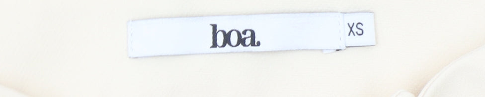 Step into timeless elegance with these beautifully tailored beige dress trousers by Boa, designed to effortlessly enhance your wardrobe with their classic yet modern silhouette. Crafted for the refined woman who values comfort and sophistication, these trousers feature a flattering high-rise waist and flared leg that elongates the figure and complements a wide range of body shapes. The sleek silhouette creates a versatile look that works perfectly for both professional and polished casual styles. Made from a premium fabric blend of polyester, viscose, and elastane, the trousers offer a smooth, lightweight feel and just the right amount of stretch to move with you throughout the day. The material combination ensures durability and comfort, maintaining structure while preventing creasing. The subtle front pleats add a tailored touch, making them ideal for office settings, formal occasions, or an elevated everyday ensemble. Finished in a fresh beige tone, these trousers pair effortlessly with a crisp blouse, structured blazer, or soft knit jumper. The minimalistic detailing and refined cut make them an easy choice for creating endless outfit combinations across seasons—from smart spring layering to chic autumn styling. With a classic zip and button fastening, these trousers ensure a secure and polished fit at all times. Perfect for business meetings, social events, or evening dining, they offer a versatile foundation for a confident and refined appearance. Conditioned in excellent pre-loved form with no visible flaws, these Boa trousers are ready to impress at great value. Make a stylish and responsible choice by adding these elegant flared trousers to your collection—designed to combine simplicity, comfort, and polished sophistication. A timeless wardrobe essential that seamlessly blends modern tailoring with effortless grace.