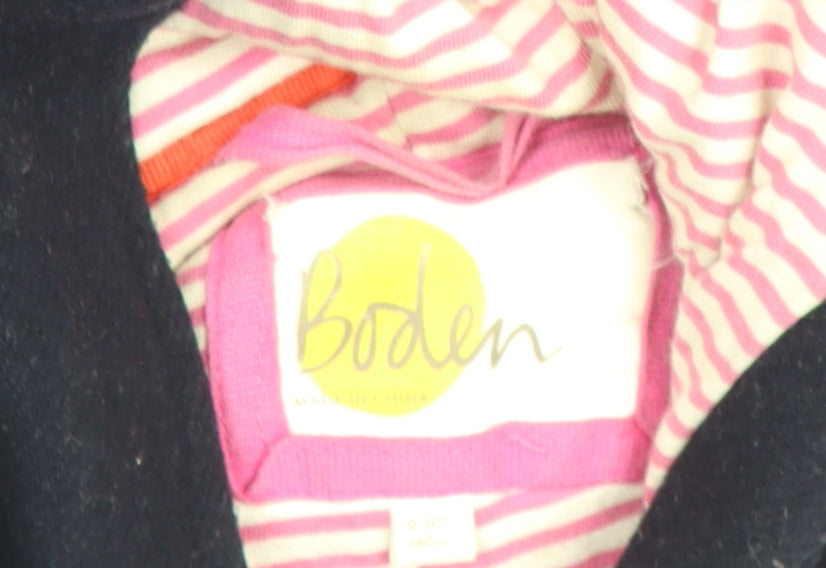 This charming Boden Girls Blue Wool Blend Duffle Coat is an ideal addition to any young fashionista’s wardrobe. Crafted from a warm and durable blend of 70% wool and 30% nylon, it offers both comfort and quality for cold weather wear. The mid-length design ensures excellent coverage, while the soft stripe cotton lining in cheerful pink and white provides added warmth and a playful contrast to the navy blue exterior. Designed in a timeless duffle style, it features classic toggle closures with wood-look fastenings, two front flap pockets for small treasures, and a practical hood to keep little heads warm during brisk days. The coat is neatly tailored for a regular fit, making it versatile for both autumn and winter seasons. Perfect for casual outings, school runs, or family weekends away, this coat reflects Boden’s signature attention to detail and blend of practicality with charm. It’s dry clean only for maintenance, showcasing the quality of the materials used. In excellent pre-loved condition, with only light signs of previous use, it has been carefully inspected to ensure continued wearability and style. Offering an appealing mix of classic aesthetic and everyday comfort, this Boden duffle coat is the perfect outerwear choice for a stylish young girl who needs reliable protection against chilly weather. If you’re looking for premium quality and timeless design from a trusted British brand, this coat is a wonderful find that will stand out while keeping your child cosy and warm. A stylish, functional, and enduring piece for any wardrobe.