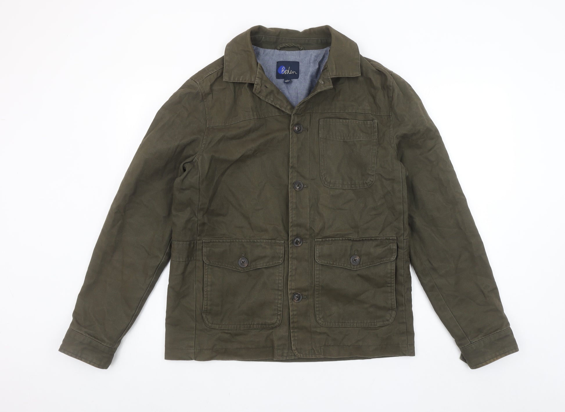 This Boden men's green cotton casual jacket is a timeless and practical wardrobe staple, designed with comfort and versatility in mind. Crafted from 100% cotton, it offers a durable yet breathable wear perfect for everyday use. The classic workwear-inspired design features a button front closure, three spacious patch pockets, and a neat spread collar for a refined but relaxed appearance. Its mid-length cut ensures a flattering silhouette, while the lined interior of cotton and polyester adds an extra layer of comfort without bulk. The olive green tone makes it an easy piece to pair with a range of casual ensembles, from denim jeans and a T-shirt to chinos and a shirt for smarter occasions. This jacket falls perfectly between smart and casual wear, ideal for layering during spring and autumn when the weather is mild. Its regular fit offers a comfortable and timeless shape suitable for most body types, while subtle stitching details enhance the garment's overall craftsmanship and durability. With its simple button accents, practical pockets, and classic styling, this Boden jacket is a versatile choice for the discerning man who values both function and understated style. Though pre-owned, it remains in very good condition, showing only light creasing consistent with gentle wear. Whether worn as an outer layer for day-to-day errands, weekend countryside walks, or a stylish addition for relaxed social occasions, this jacket stands out as a reliable and fashionable solution for transitional weather. Smart yet laid-back, it embodies Boden’s approach to modern menswear — quality materials and enduring design brought together in one easy-to-wear piece. A great choice for men seeking comfort, functionality, and effortless style in equal measure.