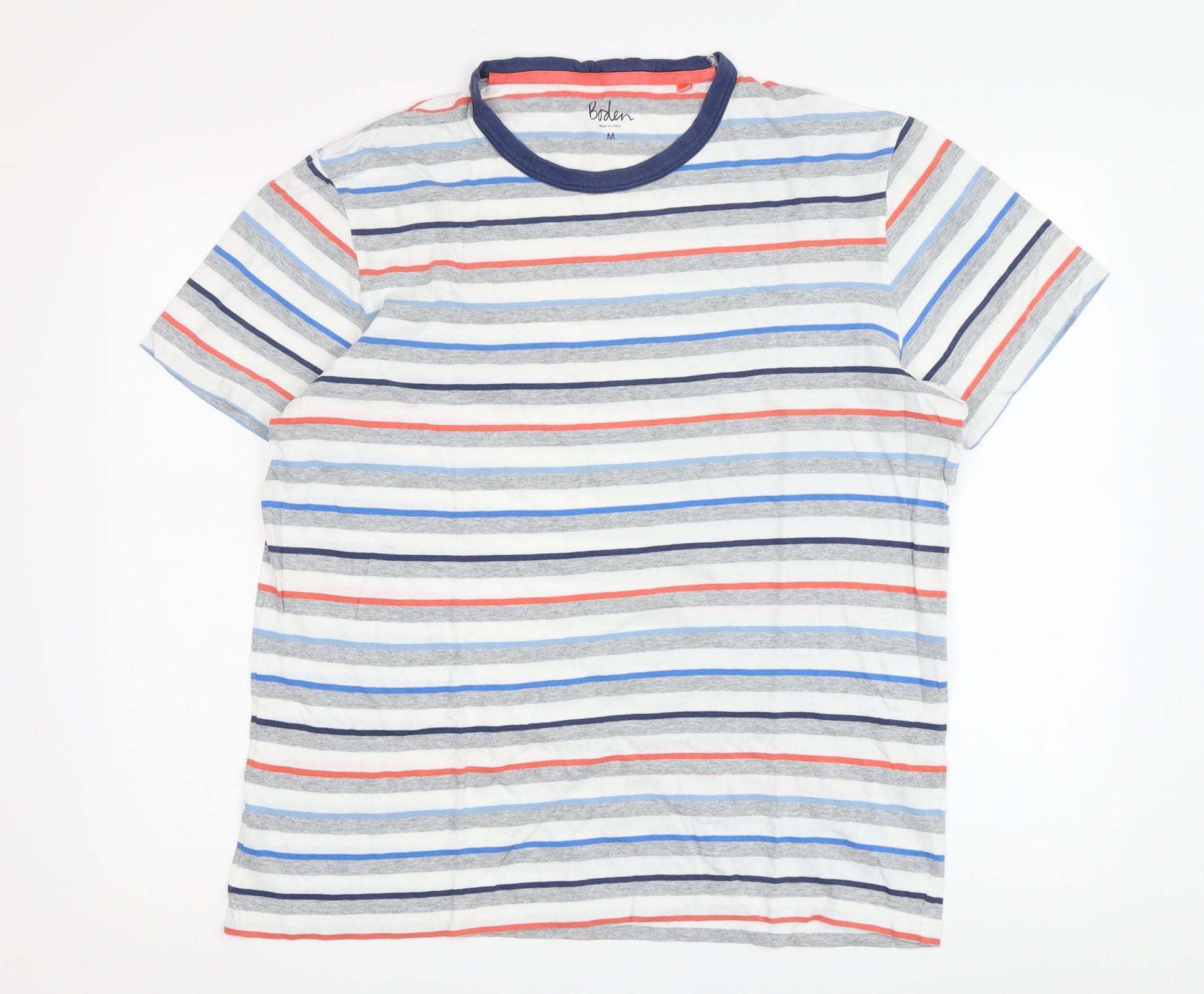 Elevate your casual wardrobe with this stylish Boden men's T-shirt, perfect for spring and summer outings. Crafted entirely from soft cotton jersey, this short sleeve T-shirt ensures maximum comfort with its breathable fabric. The eye-catching multicoloured stripes add a playful touch, making it a versatile addition for any fashion-forward individual. Designed with a classic crew neck, this regular fit T-shirt boasts easy maintenance with its machine washable care instructions. Although lightly worn, it maintains an excellent condition, making it an eco-conscious and value-driven choice for those who appreciate quality apparel. Ideal for a laid-back day at the beach or a weekend city stroll, this T-shirt offers both comfort and style without compromising the environment. Upgrade your collection today with this timeless piece from Boden.