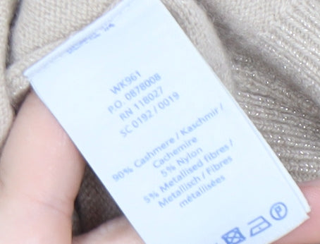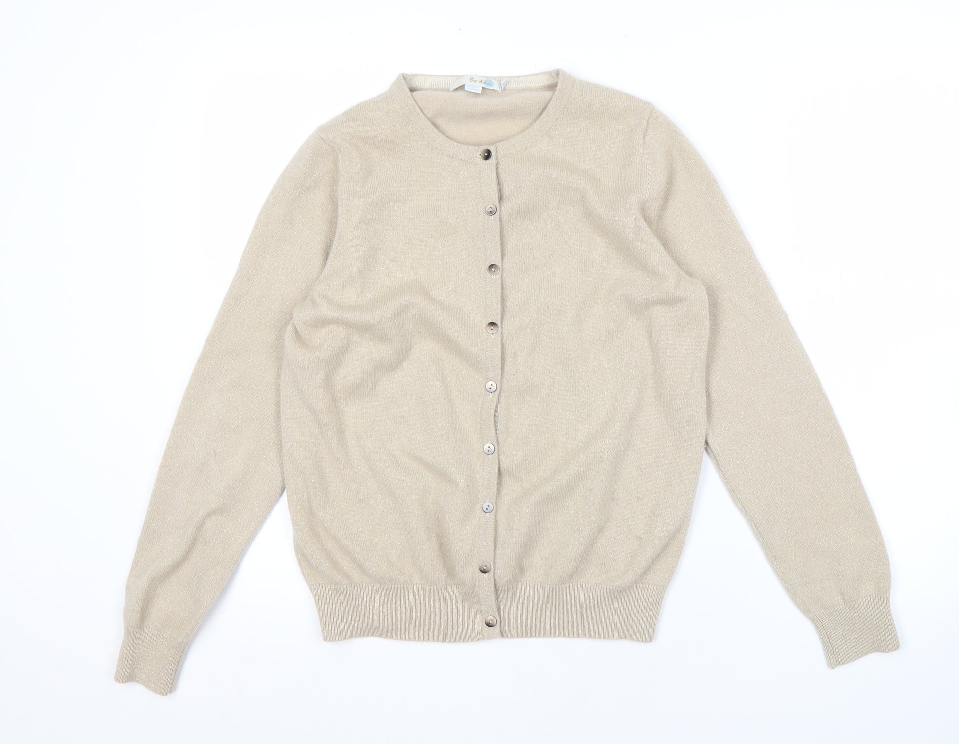 Discover elegance with this beautiful Boden women's cardigan, crafted in a luxurious beige hue that pairs seamlessly with any wardrobe piece. Made predominantly from 90% cashmere for a soft touch and excellent warmth, this cardigan also incorporates 5% nylon and 5% metallic fibres for a gentle shimmer, adding a touch of sophistication to your attire. The long sleeves and crew neckline present a classic silhouette that works well for both casual and slightly more formal settings. The button accents on the front lend a timeless appeal, making it easy to layer over a variety of outfits—whether you're dressing up for an office meeting or enjoying a relaxed weekend brunch. With its regular fit and size 16 designation, this cardigan is designed to flatter while providing comfortable wear. Ideal for all-season usage, its ability to adapt to varying temperatures makes it a versatile addition to your collection. In excellent condition without visible flaws, this piece offers style and quality without compromise. Perfect for those seeking a luxurious, yet understated garment to enhance their everyday wardrobe.
