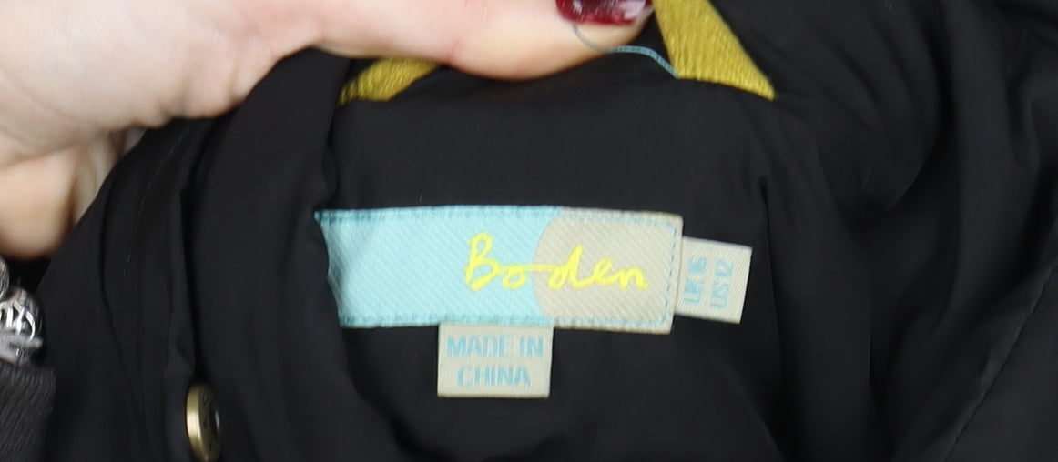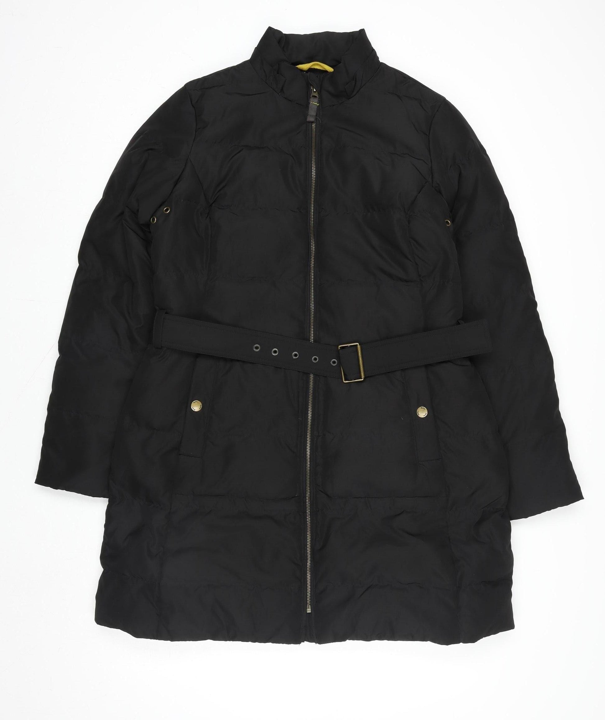 Stay warm and stylish this season with this beautiful black puffer coat from Boden. Perfectly designed for women, this long-line winter coat combines fashion and functionality, offering cozy insulation and sleek style. Crafted from high-quality 100% polyester with a smooth microfibre finish, it features a full zip fastening and elegant belted waist for a flattering shape. The quilted design not only adds texture but ensures effective heat retention. The interior is fully lined for comfort, while the filling is a premium down and feather mix, ideal for providing insulation without added bulk. The coat includes practical features like zipped fastenings, a durable buckle accent, and metallic pop buttons for added detail. With long sleeves and a classic high neckline, this piece keeps you protected from the chill while maintaining a modern silhouette. Designed for cold weather, it’s an ideal companion for brisk winter walks, everyday errands, or casual outings. Waterproof and machine washable, this coat is both stylish and effortlessly practical. Its smooth black colour allows for easy pairing with any outfit, whether you choose jeans and boots for casual days or tailored trousers for a more refined look. This versatile puffer coat is perfect for the woman who loves a polished yet functional piece in her wardrobe. In excellent pre-owned condition, showing minimal signs of use and no visible flaws, it’s an outstanding find for anyone looking for comfort, warmth, and Boden’s timeless quality. A perfect blend of durability and elegance, this long belted puffer makes an essential addition to your winter wardrobe.