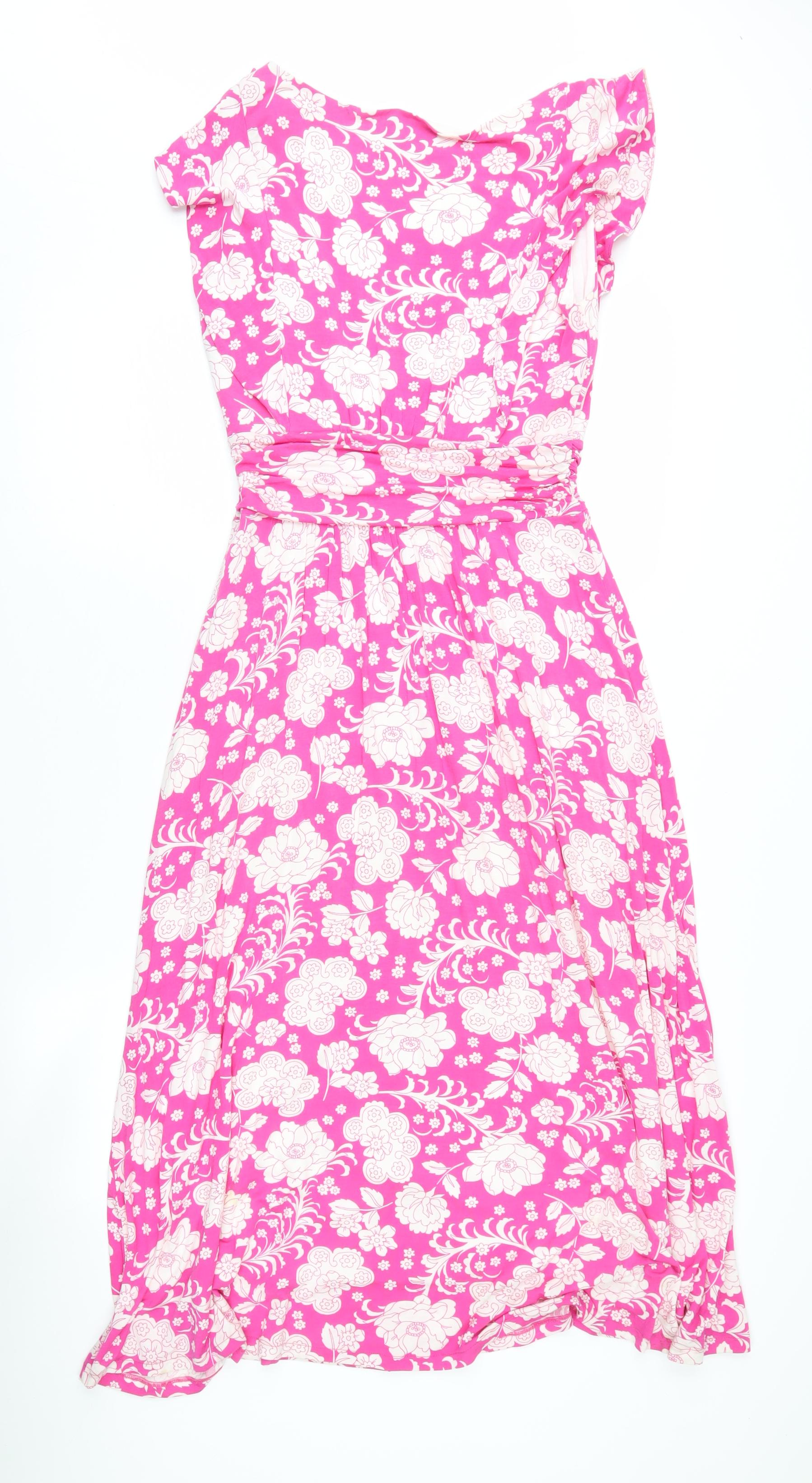 Elevate your wardrobe with this charming Boden A-Line dress, perfect for those vibrant spring and summer days. Crafted for women, this dress celebrates femininity with its delightful pink floral pattern. Cut in a flattering midi length, it is designed to offer both comfort and style for casual and special outings alike. Ideal for warm weather, this dress boasts a breathable woven fabric, primarily made of viscose for a soft feel against the skin, with a hint of elastane for a slight stretch to ensure ease of movement. The boat neck design adds a touch of elegance and sophistication, harmonising beautifully with the overall classic A-line silhouette. The dress incorporates a zip closure for a secure and streamlined fit while the lined interior offers comfort and structure. Although it is pre-owned, it remains in excellent condition with a minor imperfection that is barely noticeable and does not detract from its overall charm. This dress promises to be a versatile addition to your collection, effortlessly transitioning from casual daytime wear to an evening out. Whether paired with sandals for a relaxed look or dressing it up with heels, this pink floral midi dress by Boden is sure to become a staple in your wardrobe. Secure it today and embrace the perfect blend of style and comfort.