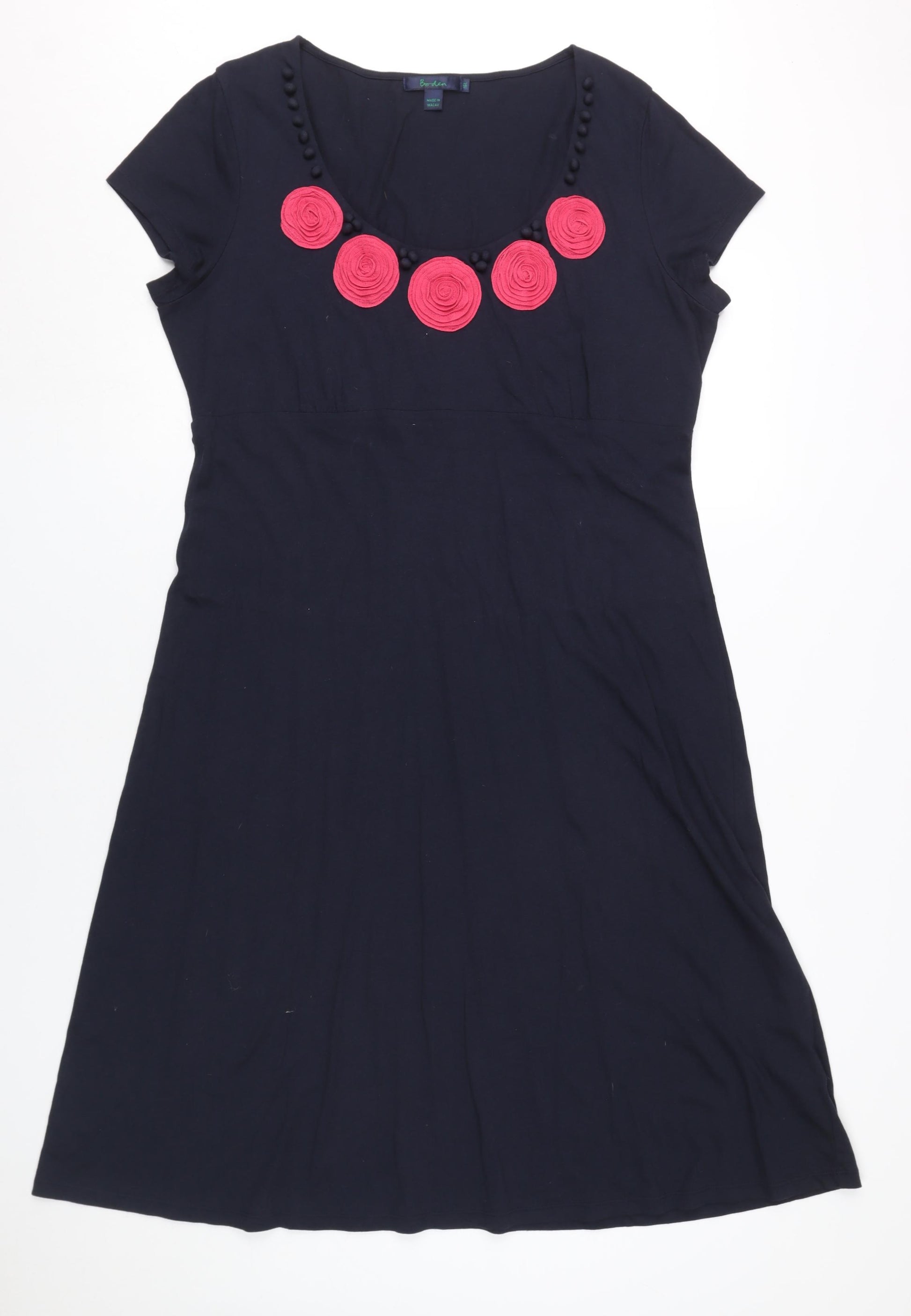 Discover effortless style with this elegant Boden A-Line dress, perfect for adding a touch of sophistication to your casual wardrobe. This knee-length dress, crafted in a soft black jersey fabric, is designed to offer both comfort and style. Featuring a flattering scoop neckline and short sleeves, it’s ideal for those looking to maintain a chic and modern look effortlessly. The dress, made of 60% cotton and 40% modal, promises a lightweight and breathable experience, making it suitable for myriad casual occasions. Its pullover design ensures ease of wear, while the delicate embroidered accents elevate its aesthetic appeal with a touch of finesse. Designed specifically for women, this regular fit dress in size 14 offers a tailored yet comfortable fit. While primarily designed for casual wear, its classic black colour allows for versatile styling, letting you transition seamlessly from daytime casual to evening elegance. The A-Line cut creates a slimming silhouette that flatters every body type, ensuring you feel confident and beautiful. Ideal for year-round wear, this dress can be layered in cooler months or worn as a standalone piece in warmer weather. Trust in the quality of Boden and enjoy the timeless appeal of this chic dress, now available in excellent condition and ready to enhance your dress collection.