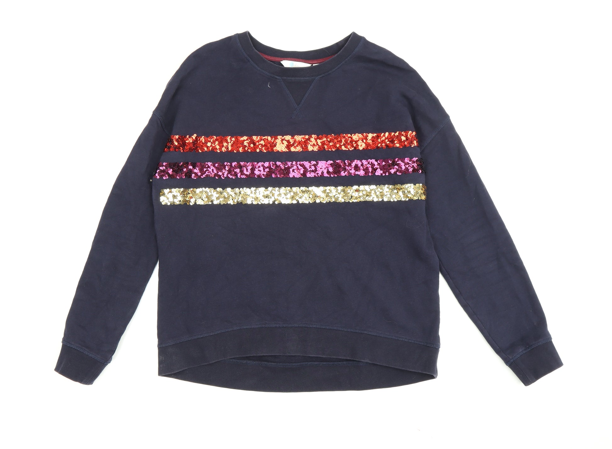 Add a touch of sparkle to your casual wardrobe with this beautiful Boden women's blue pullover sweatshirt. Crafted with comfort in mind, this sweatshirt features eye-catching sequin accents in bold colours across the chest, perfect for standing out in your everyday look. Its regular fit ensures it drapes beautifully on any body shape, while the long sleeves and crew neckline offer a classic and versatile silhouette. Made from a soft blend of 78% cotton and 22% polyester fleece, it provides warmth and breathability, making it ideal for all seasons. The sweatshirt is machine washable for easy care, keeping it looking fresh wear after wear. Designed for women who love to make a statement, it's perfect for casual outings, relaxed weekends, or running errands in style. The high-quality craftsmanship of Boden guarantees longevity, offering you a reliable essential for your wardrobe. Note: this sweatshirt is in very good condition with minor wear, but no visible damage. Style this piece with your favourite jeans or leggings for a chic, comfortable look that never goes out of style.