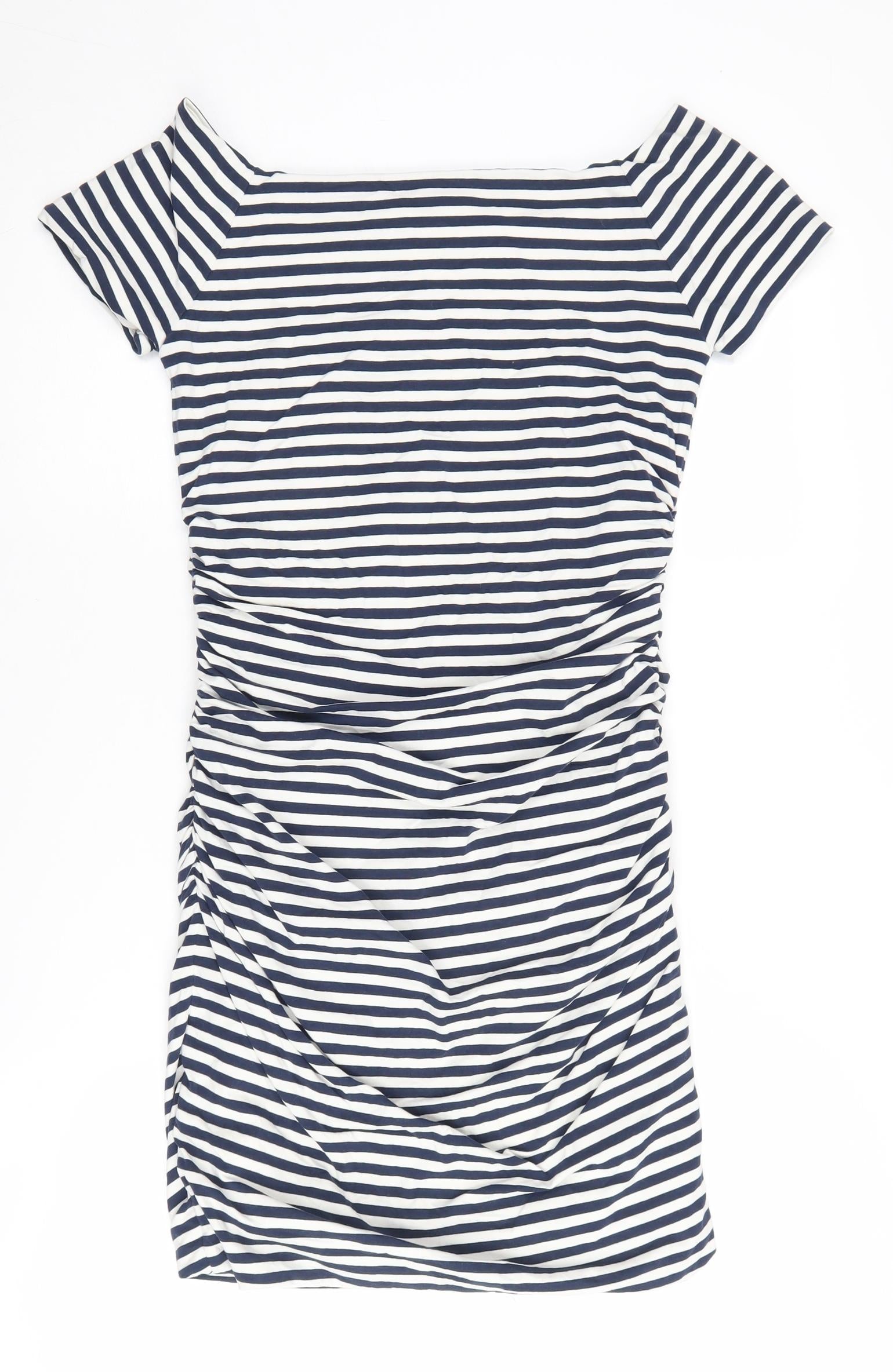 Step out in style with this classic Boden Women's Dress, featuring a chic blue and white striped pattern, perfect for casual summer outings. Crafted from a soft and stretchy cotton jersey fabric, this dress ensures comfort and a flattering fit. The shift style and boat neckline create a timeless, elegant silhouette, while the cap sleeves add a touch of modernity. Designed in a petite size 12, this piece is ideal for a flattering fit on smaller frames. Whether you're on a sunny beach stroll or enjoying a casual lunch date, this dress is versatile enough to suit any relaxed occasion. Pair it with sandals for a laid-back look or style it with a hat and tote for the ultimate summer ensemble. Don't miss out on this essential addition to your wardrobe, offering quality and style in equal measure.