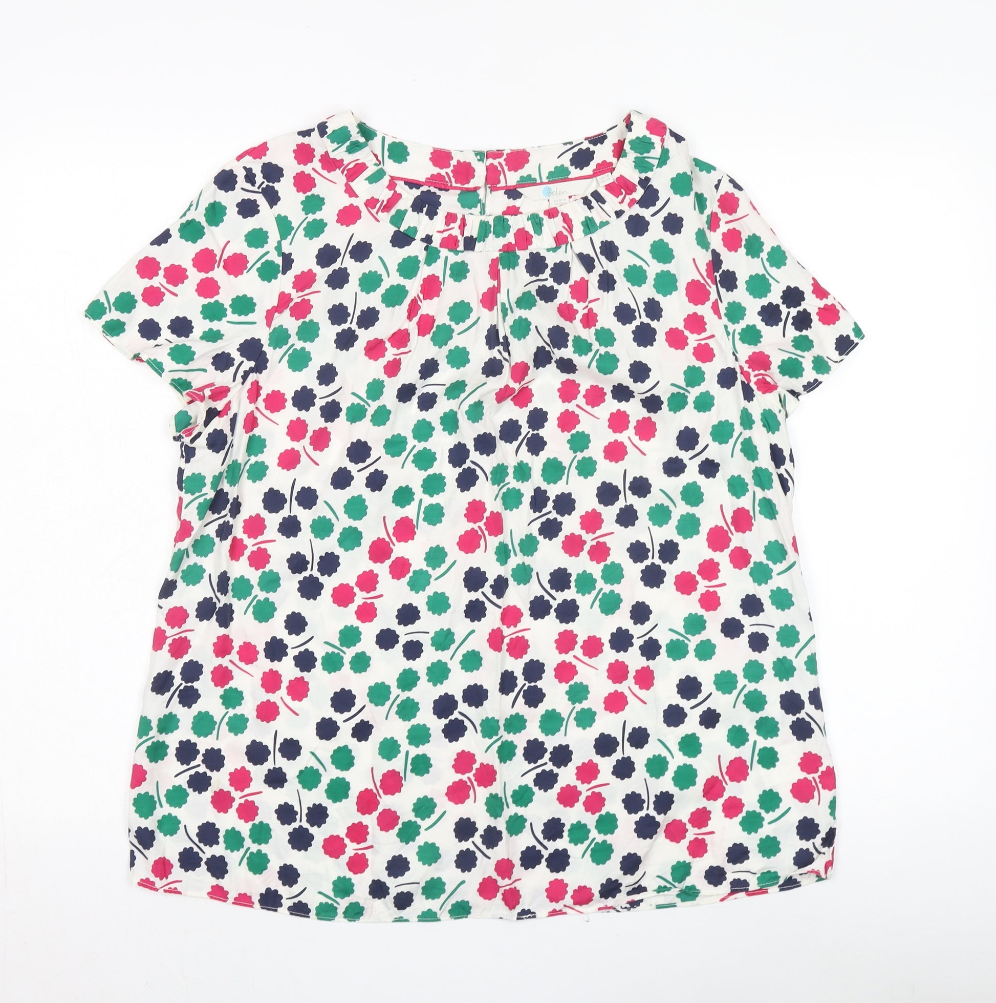 Enhance your wardrobe with this elegant Boden Women's Floral Tunic Blouse, perfect for adding a touch of sophistication to your spring and summer collection. Tailored from a luxurious silk and viscose blend, this blouse offers both comfort and an effortless, draped fit. The multicoloured floral pattern blooms vibrantly against the refined woven fabric, making it a standout piece for casual outings or garden parties. The short sleeves and classic crew neck provide a flattering silhouette, while the regular fit ensures a relaxed yet chic look. Ideal for pairing with jeans or trousers, this tunic can transition easily from day to night, offering versatility and style. Despite some light wear, the blouse remains in excellent condition, ready to be a staple in your wardrobe. Experience the lightweight, breathable fabric that promises comfort on warm days, and enjoy the ease of care with machine washable convenience. Embrace the natural elegance of this Boden blouse, a must-have for any fashion-conscious woman seeking quality and style.