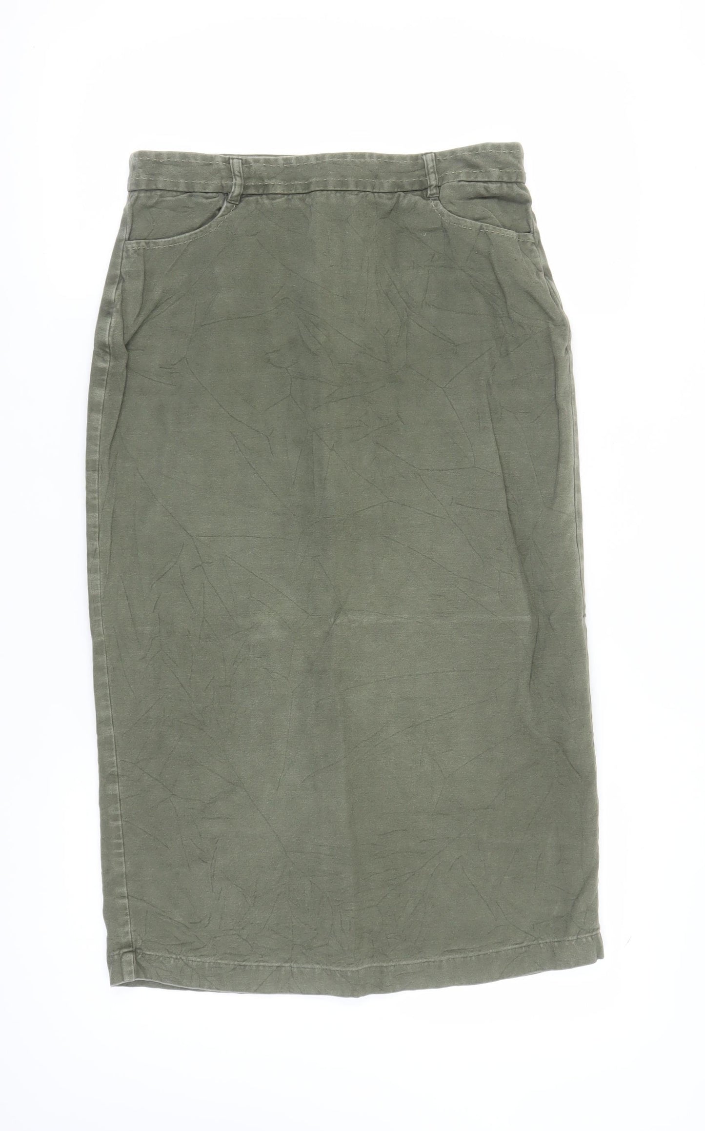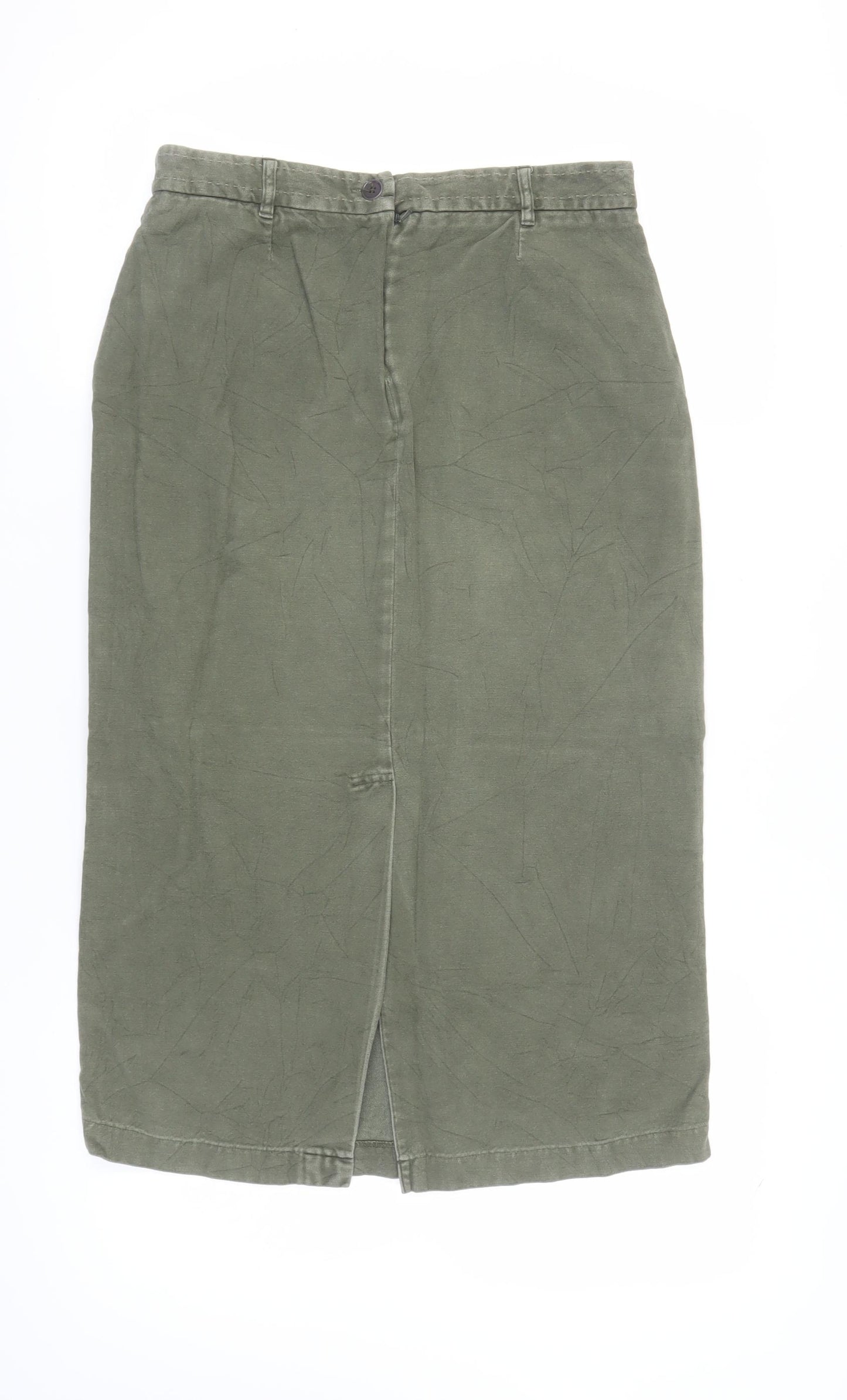 Discover effortless style with this elegant Boden women's skirt, perfect for any season. Crafted from 100% cotton, this midi-length skirt offers both comfort and versatility. The classic green colour provides a timeless appeal, making it easy to pair with various tops and accessories. Its straight and pencil style provides a sleek silhouette that flatters any body type. Ideal for casual occasions, the skirt features practical pockets and a convenient mid-rise design. The button and zip closure ensure a secure fit, while the subtle slit at the back adds a touch of sophistication. With its machine washable fabrication, this skirt is easy to care for and maintain. Although there are slight signs of wear, it remains in excellent condition. Whether you're heading to a casual outing or a day at work, this skirt is sure to become a staple in your wardrobe. Don't miss the chance to add this chic piece to your collection.