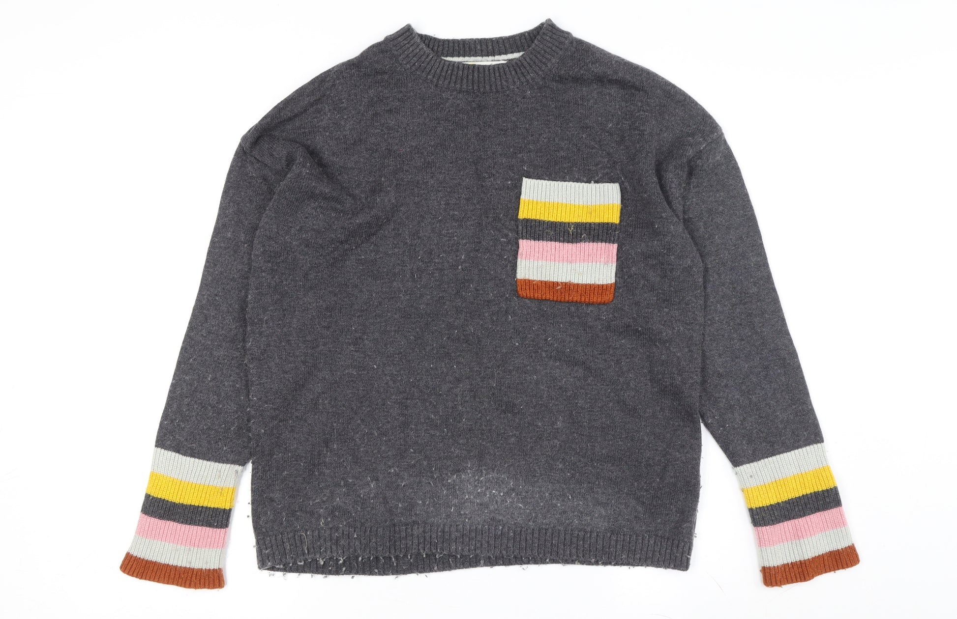 Elevate your casual wardrobe with this stylish Boden women's jumper, perfect for the Autumn and Winter seasons. In a versatile grey colour, this pullover style is designed with a classic crew neck, offering timeless appeal and comfort. Crafted from a blend of viscose, polyamide, cotton, and cashmere, it ensures a soft and lightweight feel while maintaining warmth. The long sleeves and tight-knit fabric provide added coziness, making it an ideal choice for layering. Featuring a playful pocket accent with multicoloured stripes, this jumper adds a subtle pop of colour, easily matching a range of outfits. Its regular fit and machine washable properties ensure practicality and ease of care. Despite being in very good condition, there is slight pilling throughout, which does not detract from its overall charm and style. Ideal for casual occasions, this jumper pairs effortlessly with jeans or leggings, making it a versatile addition to any wardrobe. Don't miss out on this classic piece that offers both style and comfort for all your outings.