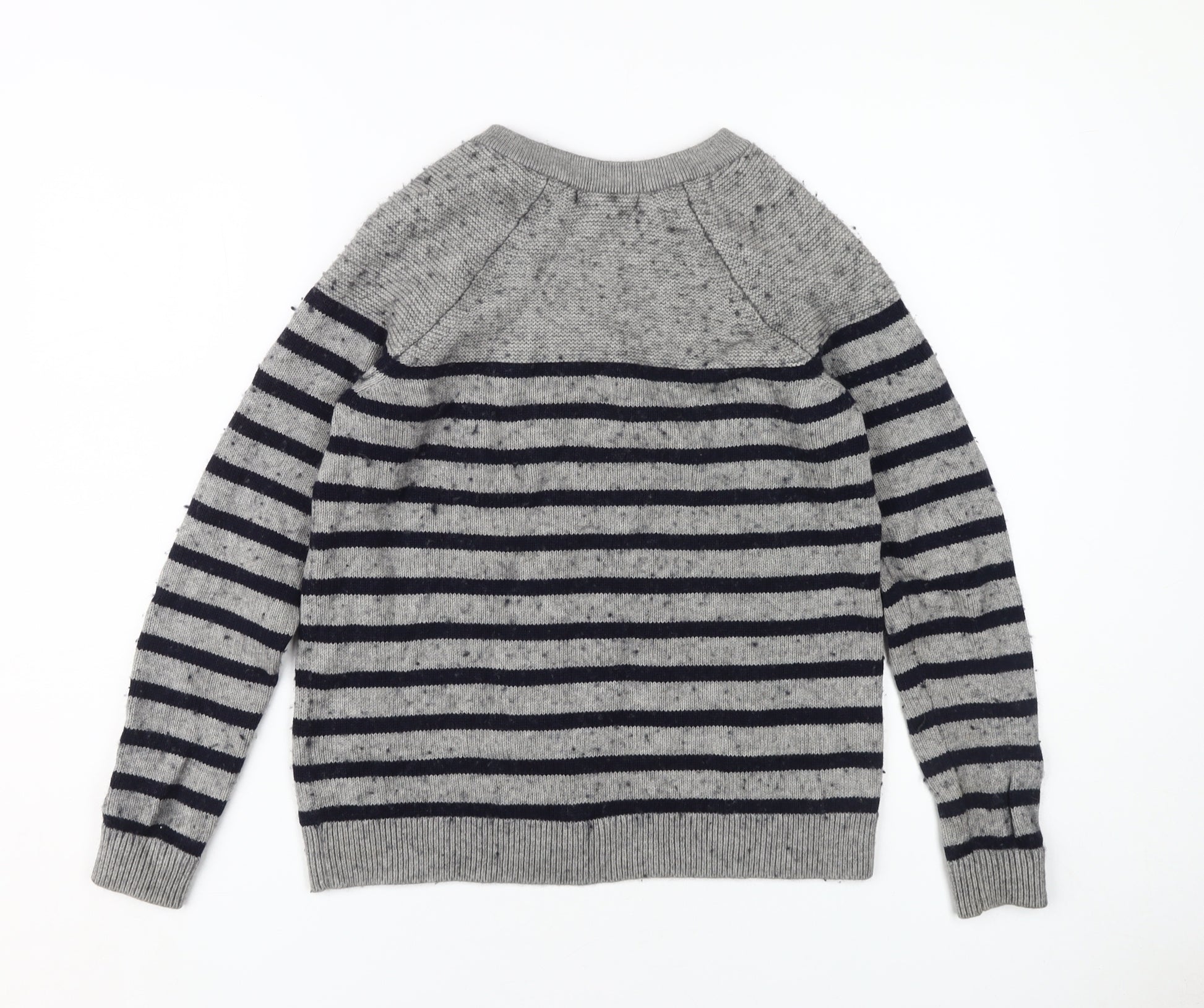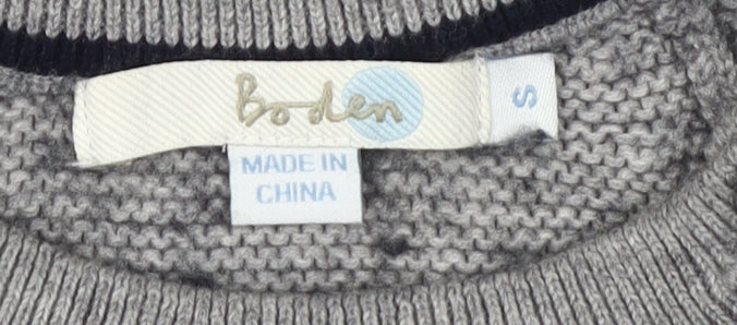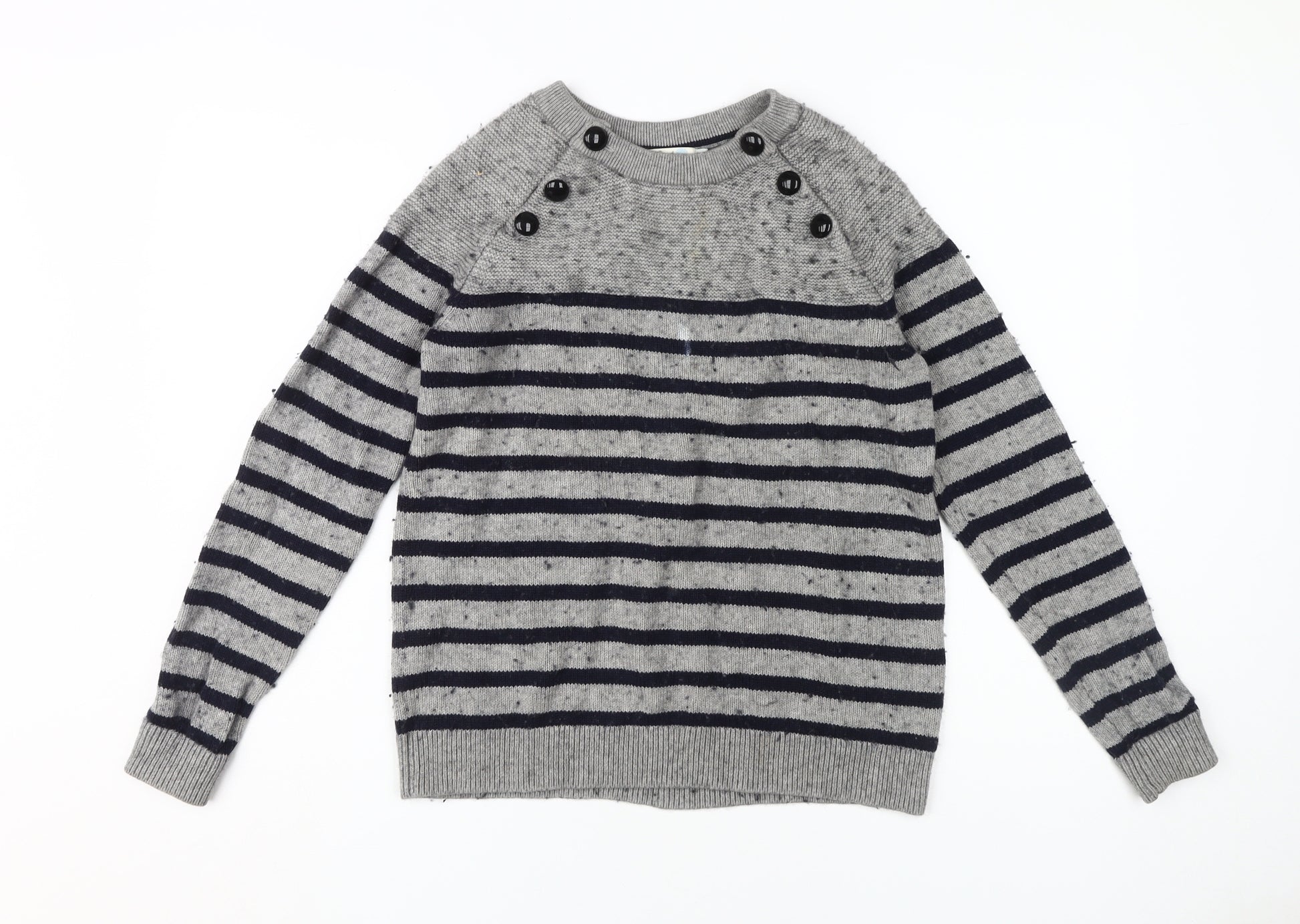 Discover effortless style with this Boden Women's Grey Striped Pullover Jumper. Crafted to perfection, this jumper combines contemporary design with everyday comfort, making it a must-have for your casual wardrobe. In a classic grey hue adorned with sleek black stripes, this jumper offers a timeless aesthetic that effortlessly transitions through seasons. Its crew neckline and raglan long sleeves ensure a flattering fit, perfect for layering over your favourite tops. Made from 80% Cotton and 20% Wool, the material provides softness and warmth, keeping you cosy on cooler days. Designed with attention to detail, it features charming button accents and a distinct striped pattern. With its comfortable regular fit, this jumper is ideal for casual occasions, whether you're out for a leisurely stroll or enjoying a coffee with friends. The jumper's machine washable care makes it convenient for everyday wear. Despite slight pilling, the condition remains excellent, ensuring ongoing wearability. Priced affordably, it brings both quality and style. Enhance your wardrobe with this versatile piece from Boden and enjoy the perfect blend of fashion and function.