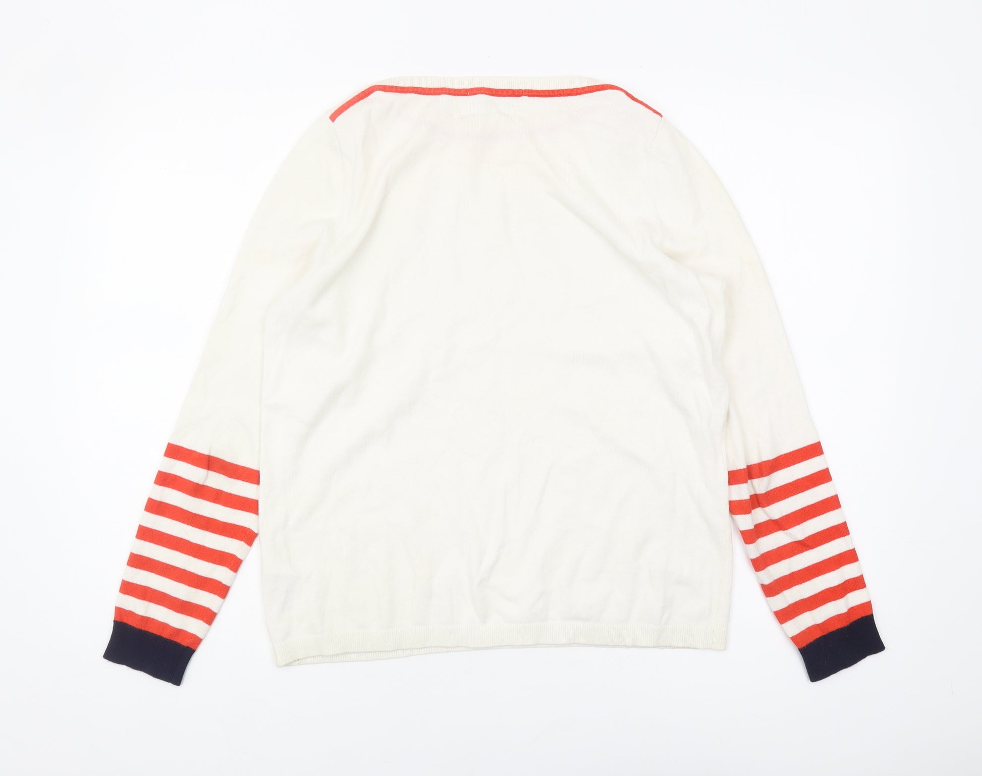 Elevate your casual wardrobe with this stylish Boden Women's Ivory Striped Jumper. Designed with a chic boat neckline and crafted from a high-quality cotton and wool blend, this jumper promises comfort and durability for everyday wear. The elegant ivory base is beautifully accented by striking striped long sleeves, adding a touch of nautical flair to your look. Perfect for transitional seasons like autumn and spring, this lightweight knit piece is machine washable, offering convenience as well as style. The regular fit and breathable fabric ensure you stay comfortable throughout the day. Whether paired with jeans for a laid-back weekend vibe or dressed up with a skirt for a polished look, this jumper is a versatile addition to any wardrobe. Embrace effortless sophistication and add this must-have piece to your collection.