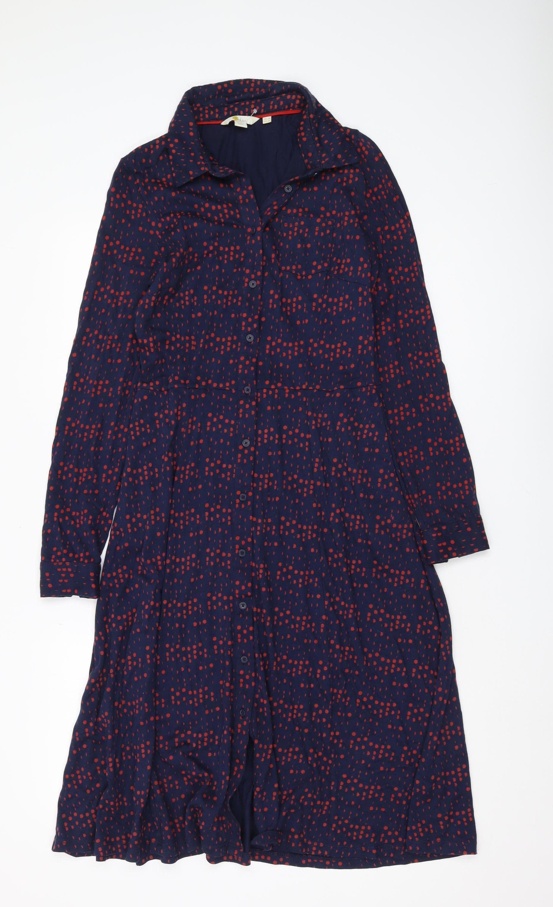 Embrace effortless style with this Boden shirt dress, perfect for both casual and semi-formal occasions. The multicoloured polka dot pattern on a classic navy background captures a playful yet sophisticated vibe. Made from a soft and comfortable blend of 52% modal and 48% cotton, this jersey fabric dress ensures a relaxed fit while maintaining its elegant silhouette. The collared neckline and button closure add a touch of classic charm, making it a versatile addition to your wardrobe. Designed with long sleeves, it's ideal for both autumn and spring seasons, offering a cosy and stylish option for transitional weather. The dress falls gracefully to a midi length, flattering for various body types. It's machine washable, ensuring easy maintenance. Whether paired with sneakers for a laid-back day out or dressed up with heels for an evening gathering, this dress is sure to be a favourite. Experience the classic yet modern appeal of this Boden creation and make a statement effortlessly.