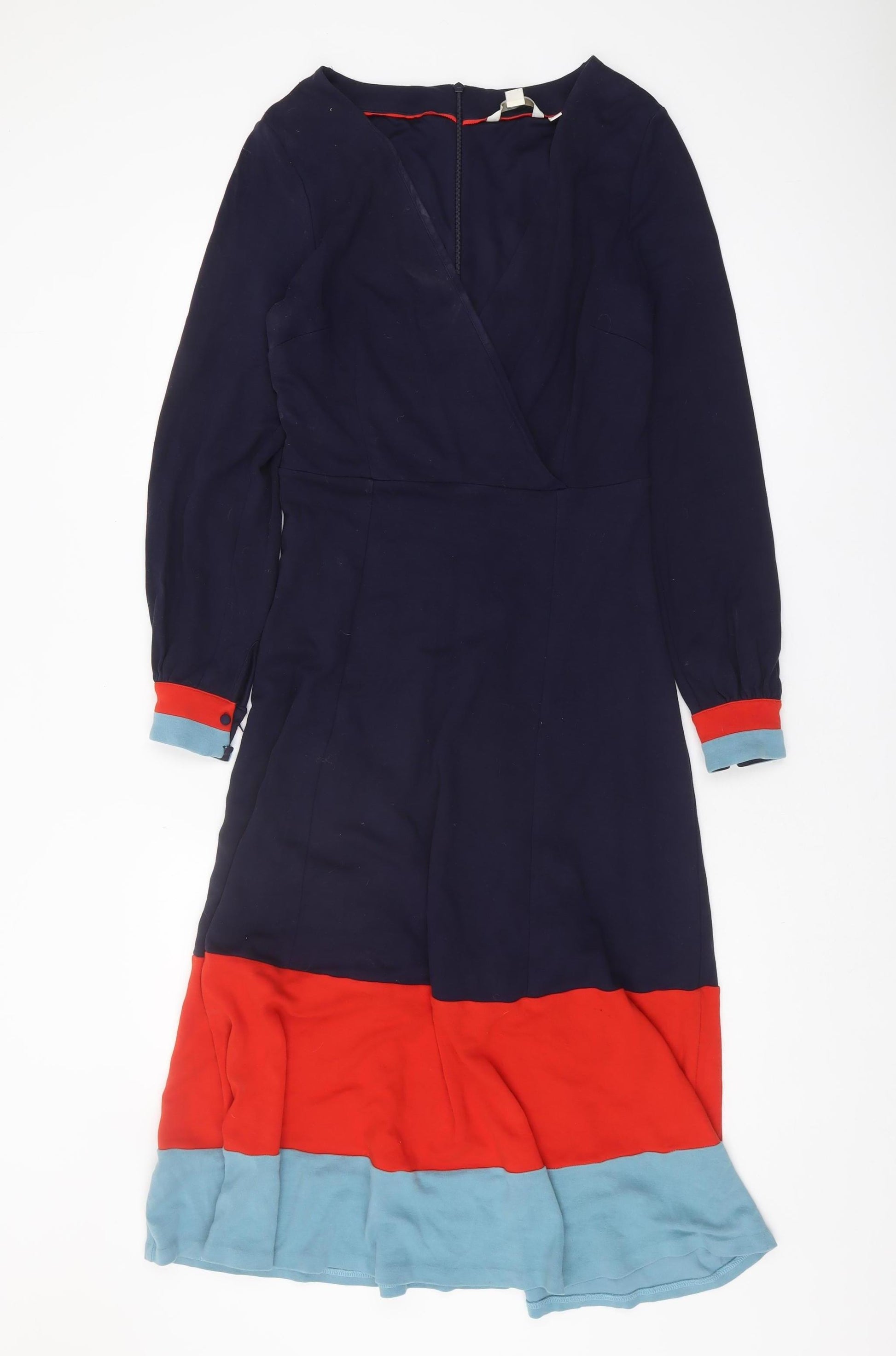 Step out in style with this sophisticated Boden Women's A-Line Midi Dress, perfect for those casual days when you still want to make a statement. Designed in a rich multicoloured hue, this dress features a striking colourblock pattern that adds a vibrant touch to your wardrobe. The long sleeves and V-neck design offer a flattering silhouette, embodying effortless elegance.Crafted from a blend of viscose, polyamide, and elastane, this woven fabric dress ensures comfort and durability, making it a dependable choice for your everyday needs. The zip closure at the back provides convenience while the button accents add a subtle decorative flair.Ideal for the transitional seasons of spring and autumn, this dress keeps you looking chic, whether you're heading to a casual brunch or a relaxed afternoon outing. Its midi length strikes the perfect balance between modesty and style. Pair it with your favourite accessories to complete a look that's both versatile and timeless.Despite showing no visible flaws, it is in excellent condition, ready to become a staple in your wardrobe. Available in size 12, this dress is tailored to fit women of all body types comfortably. Elevate your casual ensemble with this elegant piece from Boden, renowned for quality and style.