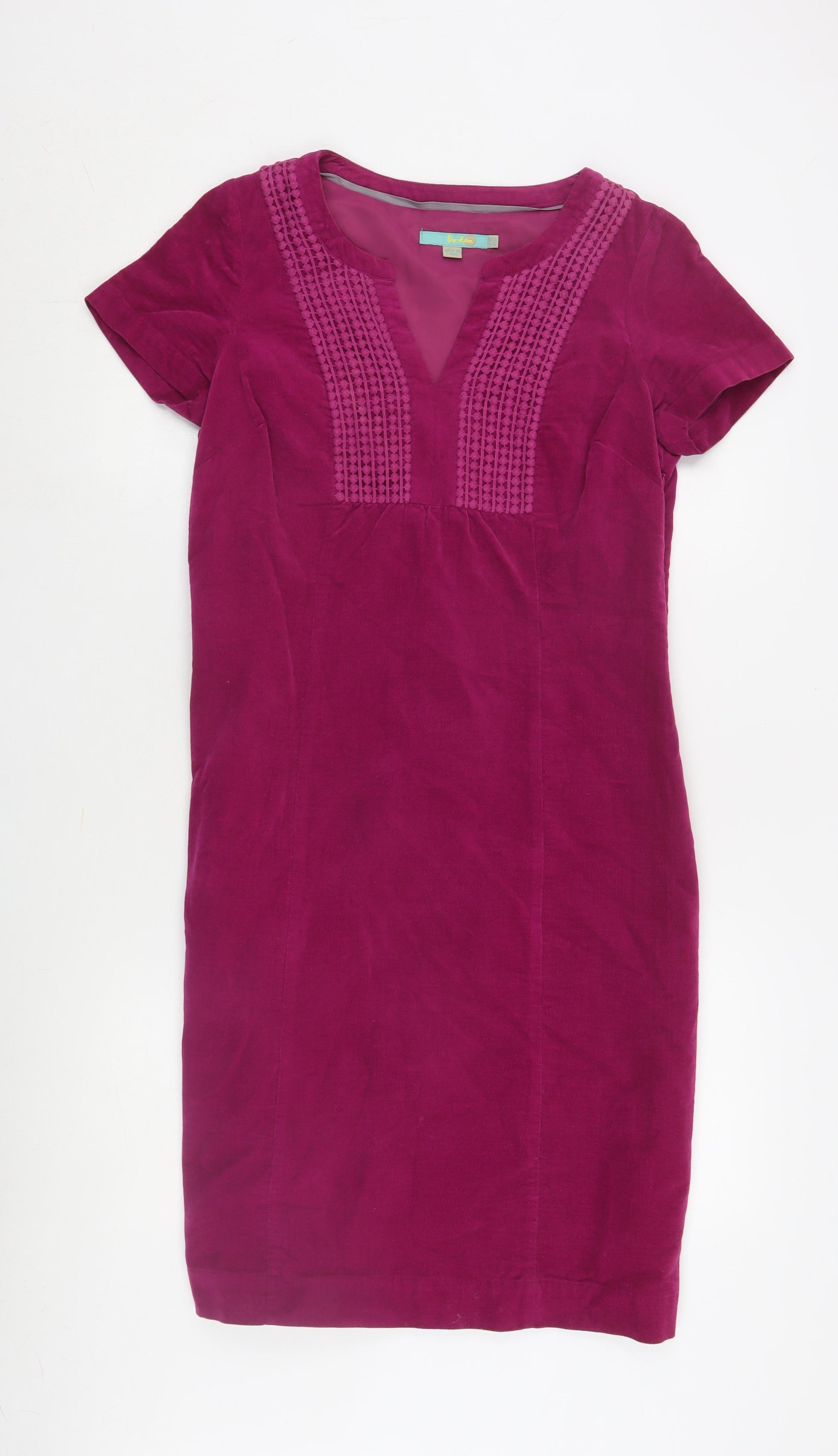 Embrace elegance with this Boden Women's Purple Sheath Dress, perfect for both casual and party occasions. Crafted in rich velour, this knee-length dress with a flattering scoop neckline and short sleeves is designed for autumn and winter outings. The dress features intricate embroidered accents on the front, adding a touch of sophistication. Made from a quality blend of cotton and elastane, it offers a comfortable fit while maintaining its shape. Fully lined, it ensures a seamless silhouette, making it a go-to choice for effortless style. Ideal for women who appreciate understated luxury, the simple pattern and exquisite texture make it suitable for a variety of settings, from casual gatherings to cocktail events. The dress is in excellent condition with minor signs of wear that do not diminish its charm. Add this versatile piece to your wardrobe, and enjoy the compliments that will surely follow at your next event. Whether styled with understated accessories for a day out or with bold jewellery for an evening affair, the elegance of this dress makes it a wardrobe essential. Don't miss out on an opportunity to own a classic piece by Boden at an attractive price. Perfect for the fashion-forward woman who loves to make a timeless statement.