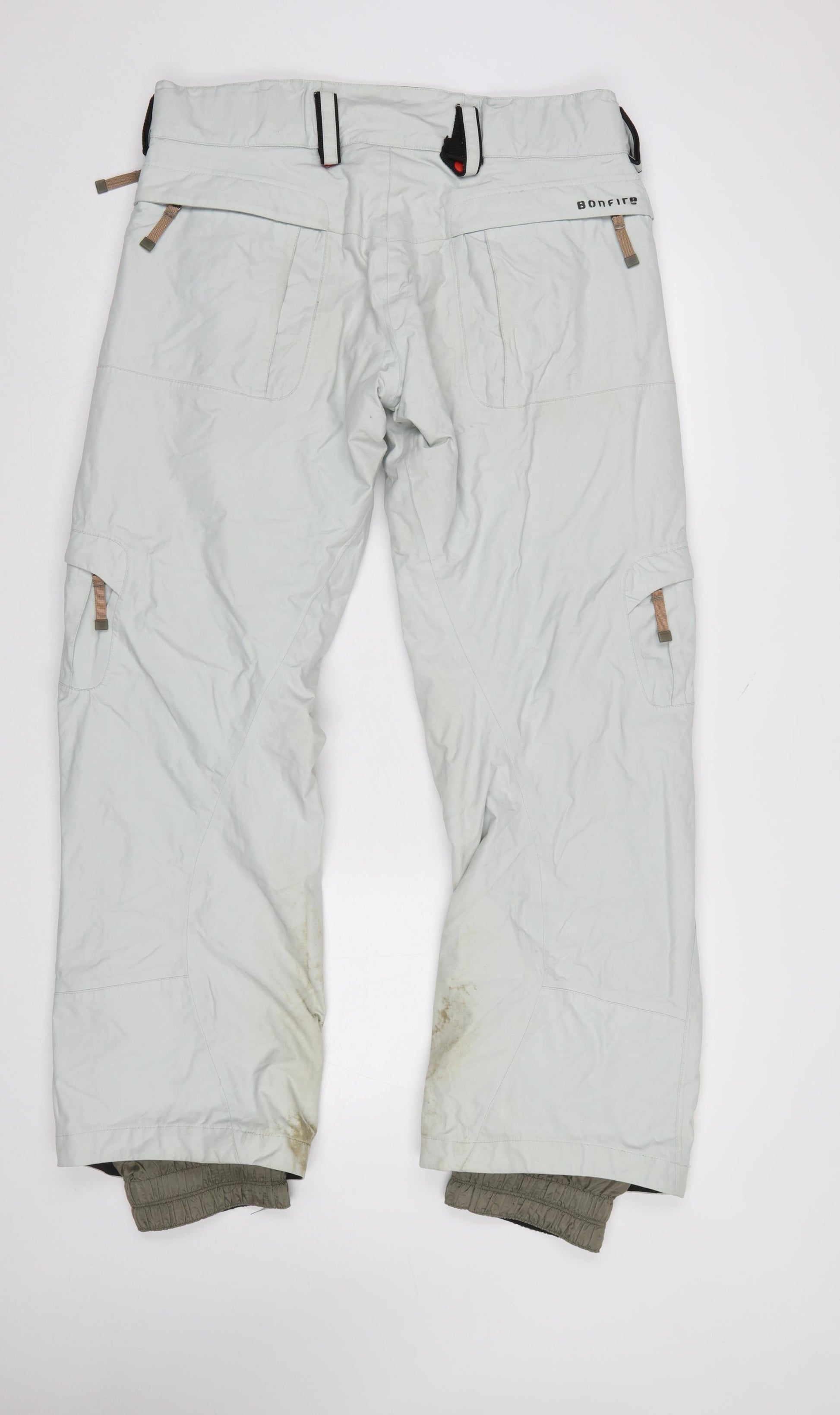 Hit the slopes or take on wet winter days in style with these Bonfire Men's Optic T10 Snow Pants. Built for performance and comfort, they feature waterproof and breathable fabric rated at 10,000 mm/10,000 g to keep you dry and comfortable no matter the conditions. Designed with a regular fit and fully seam-sealed construction, these snow trousers ensure maximum protection from the elements. The light grey exterior with subtle branding and practical pocketing delivers a smart, adventure-ready look. These trousers include a zip and button closure with adjustable waist tabs for a secure fit, alongside functional cargo and slash pockets for all your essentials. The inner lining is soft and insulated, providing extra warmth during cold weather activities. Windproof and water-resistant, they are perfect for skiing, snowboarding, or any outdoor pursuits in wintertime. While they show visible dirt marks near the cuffs, the overall condition remains very good, reflecting gentle use without structural wear. Easy to maintain and machine washable, these versatile snow pants balance durability and technical performance with understated style. Whether you're exploring mountain trails or navigating city snow, these Bonfire Optic T10 waterproof trousers will keep you dry, comfortable, and ready for action.