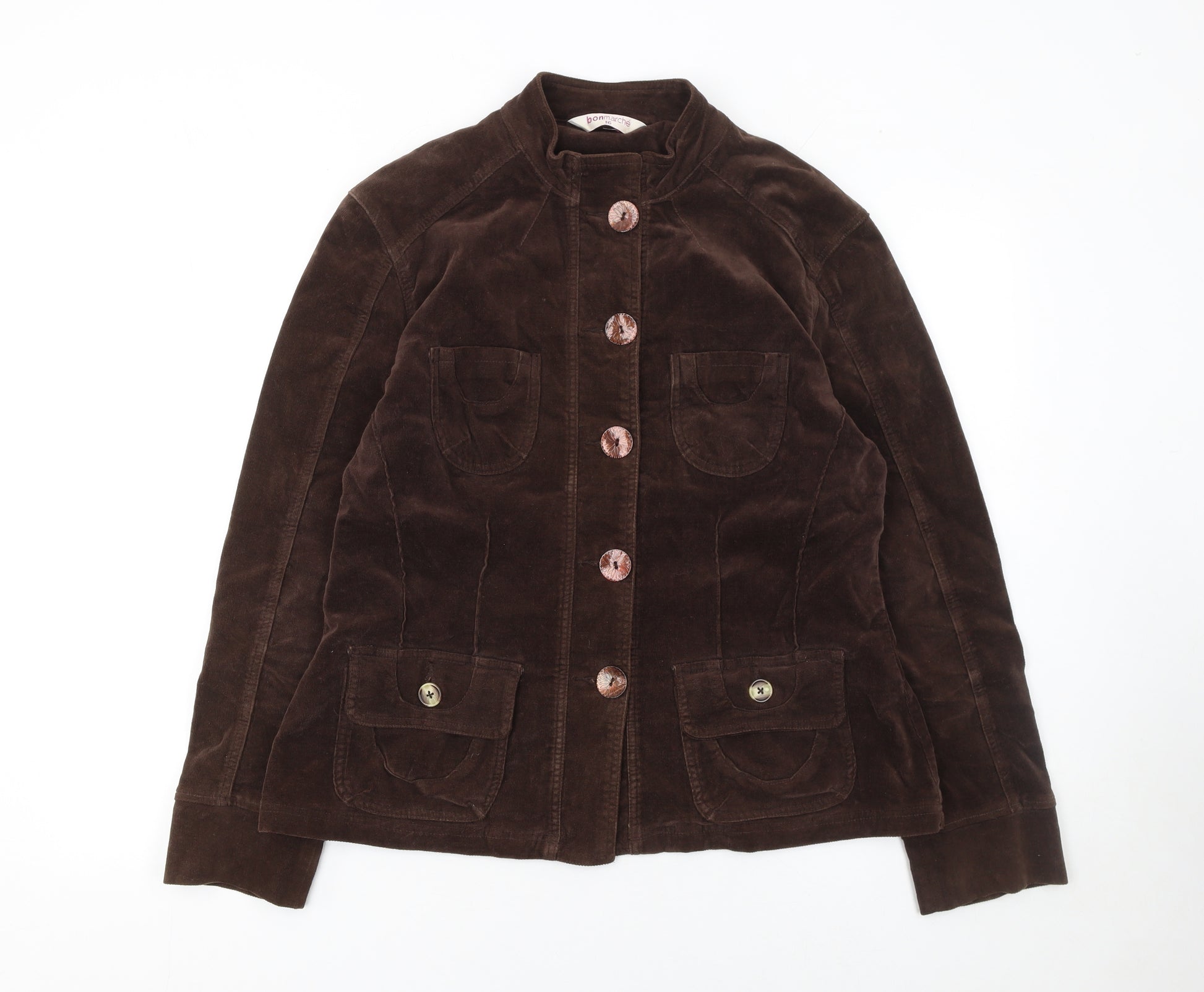 This Bonmarché women’s brown velvet blazer is a beautifully tailored piece that combines timeless sophistication with everyday practicality. Crafted from a soft, rich cotton velvet blend with a touch of elastane for slight stretch, it provides both comfort and a structured fit. The jacket is styled in a classic single-breasted cut and finished with five statement buttons, offering a smart yet relaxed aesthetic. Its deep chocolate-brown tone makes it easy to coordinate with a wide range of outfits, whether worn as part of a casual ensemble or paired with tailored trousers for a more polished look. Designed with long sleeves and a flattering regular fit, this blazer features multiple front pockets for both practicality and style. The notched neckline and structured seams subtly enhance the silhouette, making it versatile enough for workwear, lunch dates, or relaxed evenings out. Suitable for cooler seasons such as autumn and winter, the thick velvet fabric provides warmth while maintaining a touch of luxury. In excellent used condition, this piece shows only minimal signs of wear and retains its soft texture and rich colour. Perfect for women who love refined wardrobe staples with a timeless, elegant finish, this Bonmarché blazer brings a touch of class to any outfit while remaining incredibly comfortable to wear. Pair it with jeans for a chic daytime look or over a blouse and skirt for a more sophisticated feel. A stylish and versatile addition to any wardrobe.