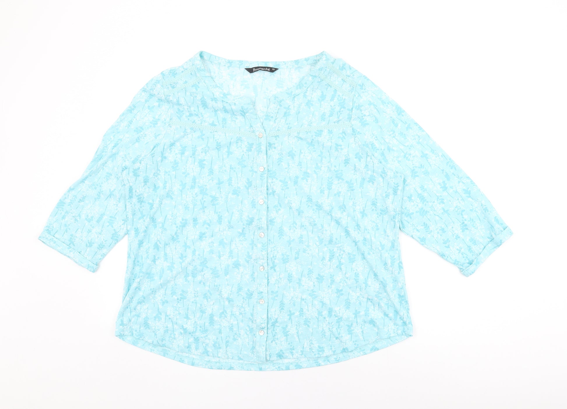 Womens Blue Floral Polyester Basic Button-Up Size 22 V-Neck