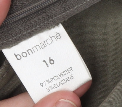 This elegant Bonmarché women's A-line midi skirt in a versatile brown hue offers classic comfort and timeless appeal. Designed in a flattering mid-rise fit, the skirt drapes beautifully and gently flares towards the hem to create a graceful silhouette that moves with you. Crafted from a soft and flexible blend of polyester and elastane, it provides a comfortable stretch fit that holds its shape wear after wear. The medium-length cut makes it perfect for all-season wear — pair with boots and a knit in cooler months, or a blouse and sandals for spring and summer. The skirt’s simple, seam-detailed design ensures it can easily be styled both casually and smartly, depending on your occasion. Its zip closure allows for ease of dressing while keeping a smooth finish at the waist. Conditioned in very good pre-loved state, there are only minimal signs of light wear and faint markings near the hem, barely noticeable when worn. Whether you are dressing for the office, a casual lunch date, or simply refreshing your everyday wardrobe, this classic Bonmarché skirt is an effortlessly chic choice. Its muted earthy tones make it easy to pair with a variety of tops, jackets, and accessories, creating endless outfit possibilities. A true wardrobe staple, this mid-length skirt combines comfort, simplicity, and understated sophistication — ideal for women who appreciate quality and style. Machine washable for easy care, this versatile skirt is ready to wear and keep you looking polished from day to night.