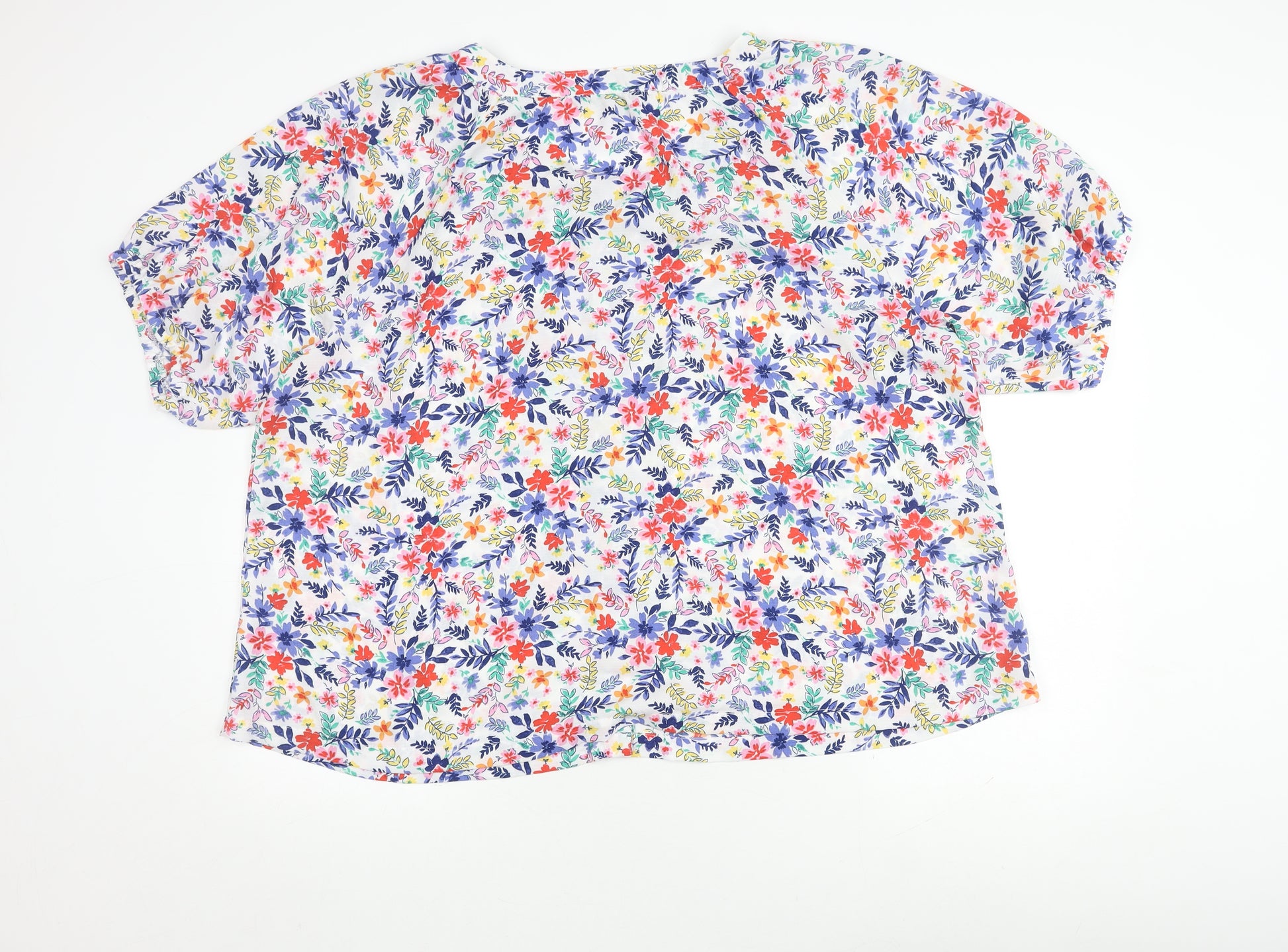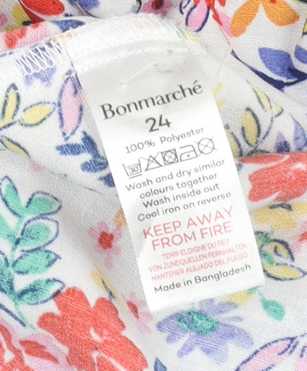 Enhance your spring and summer wardrobe with this charming Bonmarché short sleeve top, designed specifically for women who appreciate style and comfort. This plus-size top, in size 24, showcases a vibrant multicoloured floral pattern that is perfect for adding a touch of colour to your casual wear collection. Made entirely from soft and durable polyester, it is both lightweight and breathable, ensuring comfort on even the warmest days. The top's machine washable design means it's easy to maintain, providing a go-to piece that's as practical as it is stylish.The floral pattern on this garment makes it an excellent choice for casual settings—be it a lunch with friends, a day out, or a relaxed picnic. Although this top does not have an official neckline or sleeve type, its loose fit and floral design create a flattering silhouette that can complement different body shapes. The lack of embellishments or quirkier accents ensures it remains an elegant, understated piece that can easily be paired with jeans or a skirt. Opt for this Bonmarché top to infuse effortless style into your life.Despite being pre-owned, the item is in excellent condition with no visible flaws. Similar tops retail for about £12.75, making this a competitively priced addition to any wardrobe. With its gorgeous print and practical care qualities, this top is sure to become a beloved staple in your collection for seasons to come.