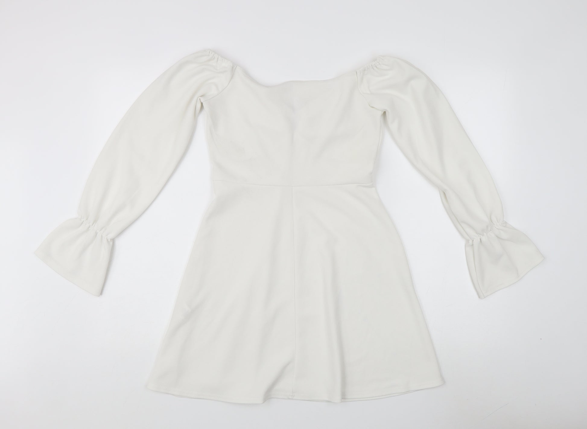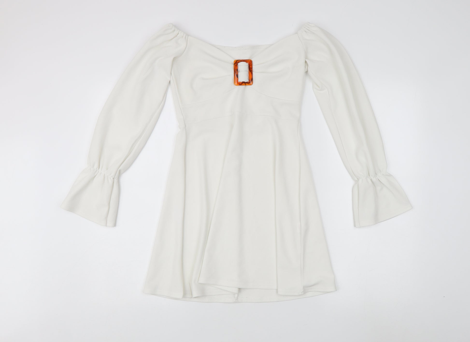 Elevate your wardrobe with this elegant white A-Line dress from Boohoo, perfect for creating a statement look at any occasion. This stunning dress in a size 10 features a chic off-the-shoulder neckline that gracefully enhances your shoulders, while the bell sleeves add a touch of glamour. Crafted with a comfortable blend of 95% polyester and 5% elastane, the fabric offers a woven texture that complements its short, flattering length. The dress includes an eye-catching buckle accent, making it a unique addition to your collection. Made in the UK, the quality ensures durability and comfort, perfect for women seeking style and elegance. This dress remains in brand-new condition with tags, reflecting its pristine quality. Ideal for casual or dressy events, this dress can be paired seamlessly with your favourite accessories. Add a touch of sophistication to your outings with this Boohoo masterpiece.