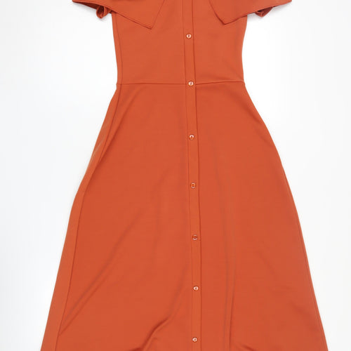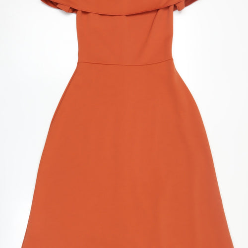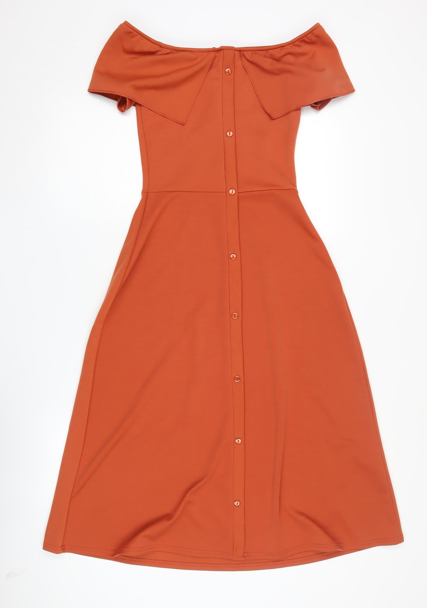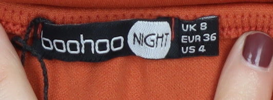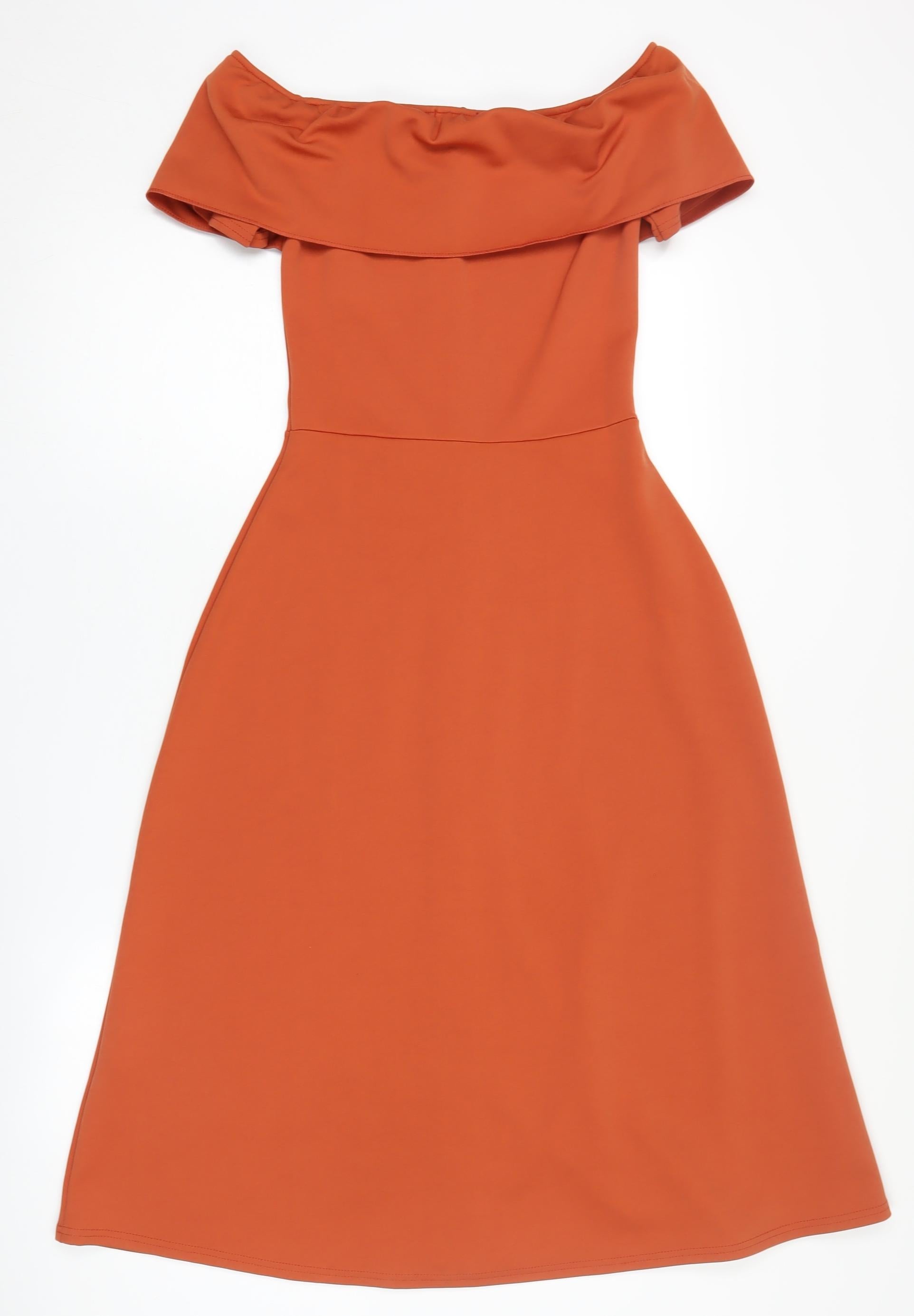 Elevate your party wardrobe with this striking Boohoo A-Line dress, perfect for cocktails or any special occasion. Crafted in a captivating orange hue, this dress features an elegant off-the-shoulder neckline that adds a touch of sophistication. Made from a comfortable and stretchy jersey fabric blend of 95% polyester and 5% elastane, it fits effortlessly, emphasizing your silhouette. The dress secures with chic buttons, adding an element of flair to the design. Despite its excellent pre-owned condition, there are no visible flaws or marks, ensuring a polished look for any event. Ideal for women who appreciate both style and comfort, this dress in size 8 is sure to make you shine wherever you go.
