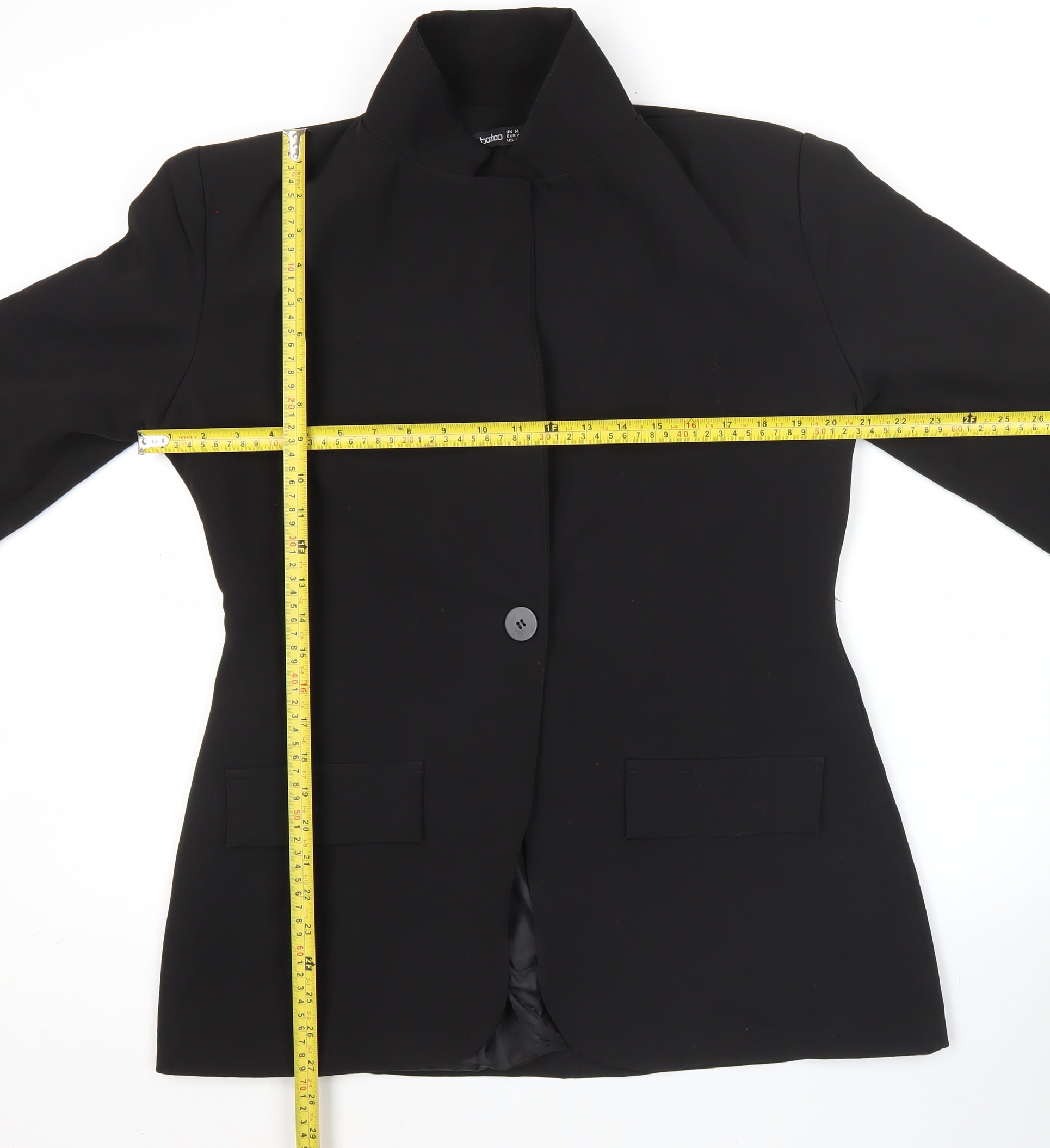 Elevate your wardrobe with this versatile Boohoo women’s black blazer jacket in UK size 14, designed with a timeless single-breasted fit. Crafted in Italy, this blazer is made from a high-quality woven fabric blend of 90% polyester and 10% elastane, ensuring durability with a subtle stretch for added comfort. The jacket is fully lined with polyester, creating a smooth interior for wearability throughout the day. The tailored design features a classic notch lapel, one-button front fastening, and long sleeves, making it a wardrobe essential that balances business formality with modern style.This Boohoo blazer is ideally suited for multiple occasions including business wear, formal events, or smart workwear. The minimalist design and solid black colour make this piece easy to pair with trousers, skirts, or dresses for a polished look. The regular fit and longline cut provide a flattering silhouette, while structured shoulders and shaping seams add a touch of refinement. Its simple yet stylish construction ensures timeless appeal, so you can wear it from season to season with confidence.Designed for autumn, winter, and cooler spring days, this jacket works beautifully layered over blouses, tops, or dresses. The versatile design makes it a go-to piece for office days, professional meetings, evening events, or occasions where a smart and sleek appearance is required. Whether styled with tailored trousers for a complete power suit, or with jeans to elevate a casual look, this blazer is an essential investment piece for the fashion-forward woman.Although pre-loved, this jacket remains in very good condition with only light marks on the sleeve that do not detract from its overall stylish appeal. It retains a clean finish and maintains its shape, offering excellent value compared with brand new alternatives. If you’re seeking a chic, affordable, and functional staple piece that embodies both practicality and elegance, this Boohoo single-breasted black blazer is the perfect choice for your wardrobe.