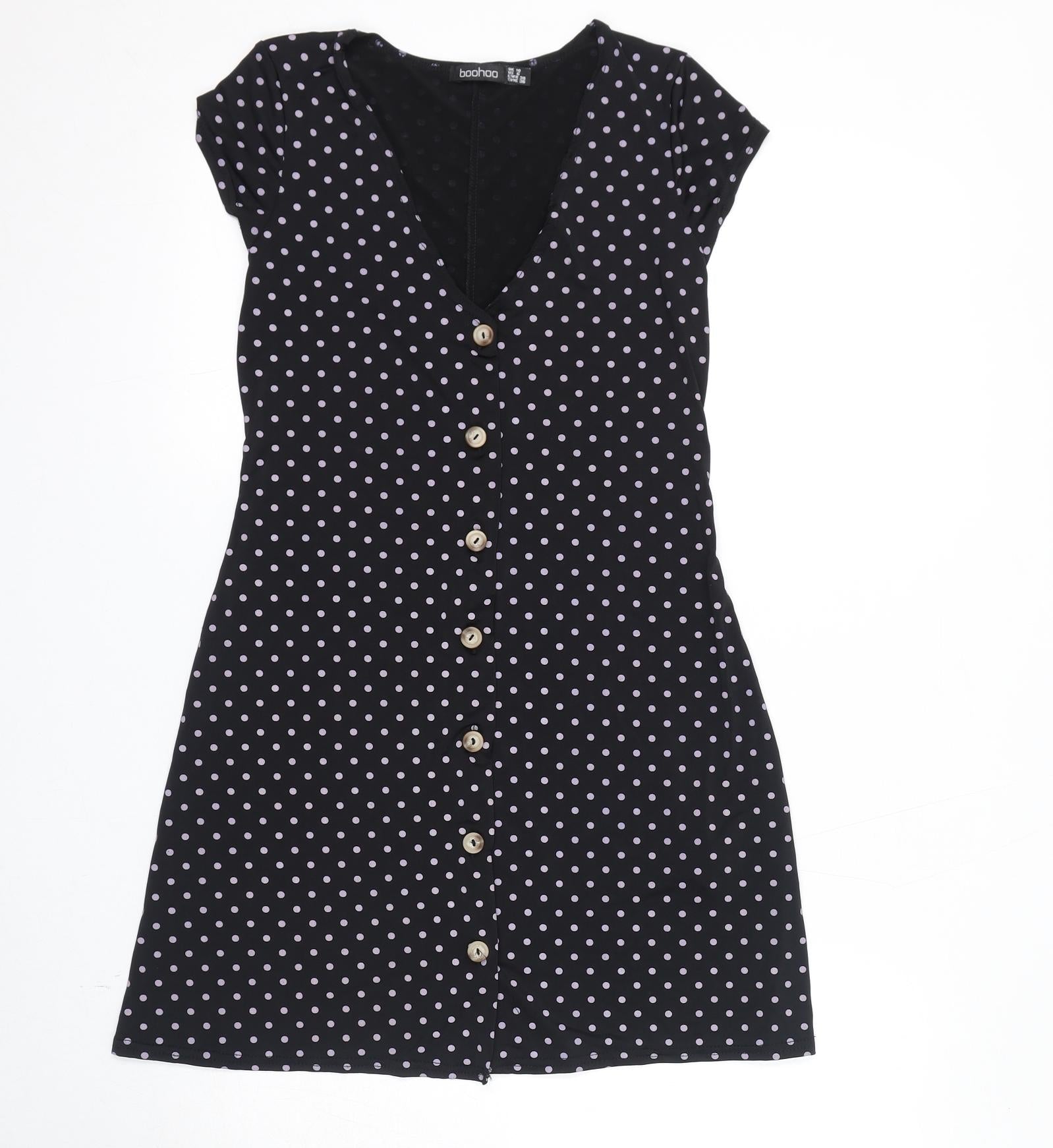 Womens Black Polka Dot Polyester A-Line Size 10 V-Neck Button