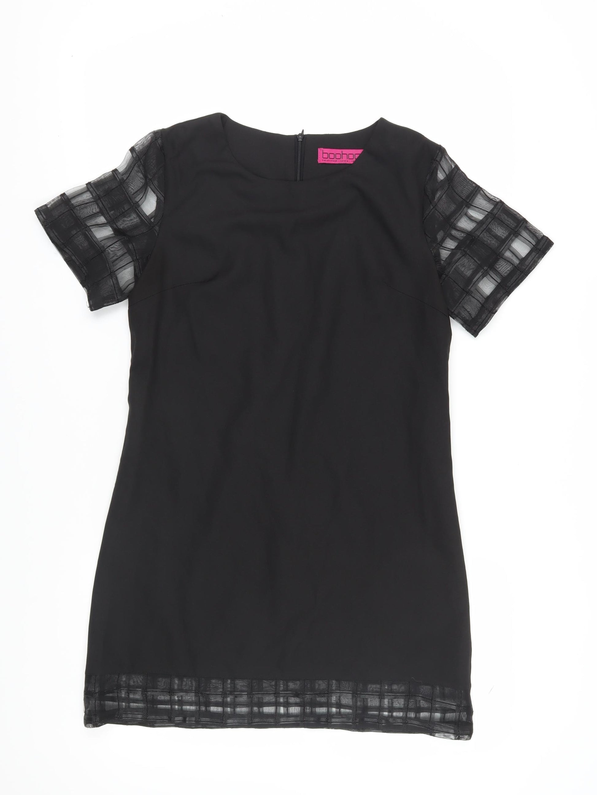 Elevate your wardrobe with this chic Boohoo shift dress, perfect for party and cocktail events. In a classic black hue, this dress features delicate sheer flutter sleeves, adding a touch of elegance and sophistication. Crafted from 100% polyester, its woven fabric ensures breathability, making it ideal for summer occasions. With a flattering short length and round neckline, this dress offers a timeless silhouette that complements the wearer beautifully. The convenient zip closure ensures ease of wear, while the absence of patterns allows for versatile styling. Brand new with tags, this piece maintains impeccable condition, promising long-lasting wear. Whether dressing up for a summer soirée or adding a hint of glamour to an evening out, this Boohoo dress is the perfect choice. Embrace effortless style while exuding confidence and grace in this stunning shift dress.
