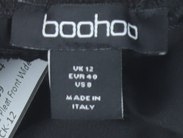 Step out in style with this chic Boohoo women's black strapless jumpsuit in size UK 12. Perfect for any party, cocktail event, or an evening out, this jumpsuit combines sleek sophistication with a modern wide-leg design. The strapless neckline adds an elegant and confident touch, while the pleat detailing along the front enhances a flattering silhouette. Crafted from a soft woven blend of polyester and elastane, the fabric offers both stretch and comfort, allowing ease of movement while maintaining its structured look. The smooth finish ensures a timeless all-black outfit that becomes a versatile wardrobe staple for effortless styling. Cut in a regular fit with a wide-leg style, the jumpsuit creates a balanced and elongating look suitable for many body shapes. It fastens with a concealed zip, keeping the design sleek and fuss-free. The sleeveless design makes it a perfect choice for warmer months, though it can just as easily be layered with jackets or shawls for transitional or cooler weather. Lightweight yet durable, this jumpsuit is machine washable, ensuring easy care without compromising its stylish appeal. This piece is ideal for women who love versatile dressing, easily transitioning from casual evenings out to more formal party occasions with the right accessories. Pair it with stilettos and statement jewellery for a glamorous look, or opt for flats and a cropped jacket for a chic, pared-back style. Brand new with tags, this jumpsuit ensures you enjoy it in pristine condition, giving you great value for money. Its classic black hue makes styling simple and opens endless outfit possibilities, while the comfortable stretch fabric makes it a go-to option for nights when both style and comfort matter. Whether you're attending a special occasion or simply want to elevate your evening look, this Boohoo strapless wide-leg jumpsuit is an essential addition to your wardrobe.
