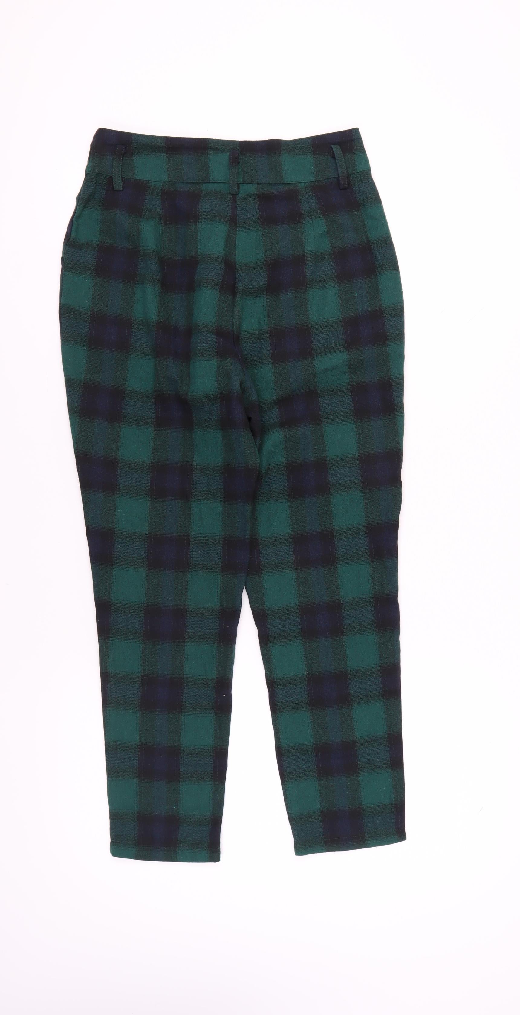 Step into the season with these stylish Boohoo women's trousers, featuring a striking green plaid pattern. Perfectly suited for casual occasions, these trousers are crafted from soft flannel, ensuring comfort and warmth during the cooler months of autumn and winter. The regular fit and straight leg style make them versatile for various outfits, while the mid-rise waist provides a flattering silhouette. With convenient pockets and a classic button and zip closure, these trousers offer both style and practicality. Ideal for a casual day out, pair them with your favourite top and shoes for a chic look. Available in size 12, these trousers promise to be a trendy addition to your wardrobe. Machine washable for easy care.